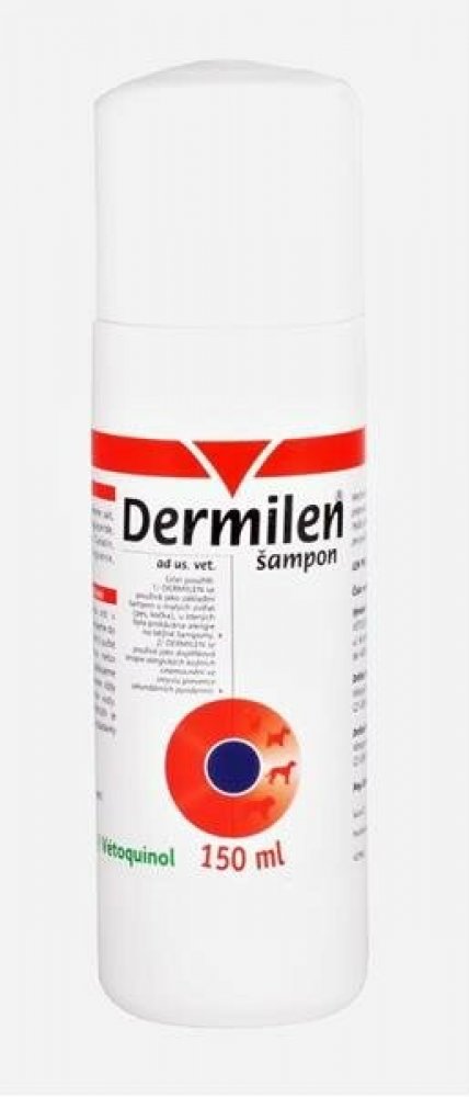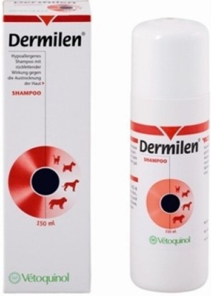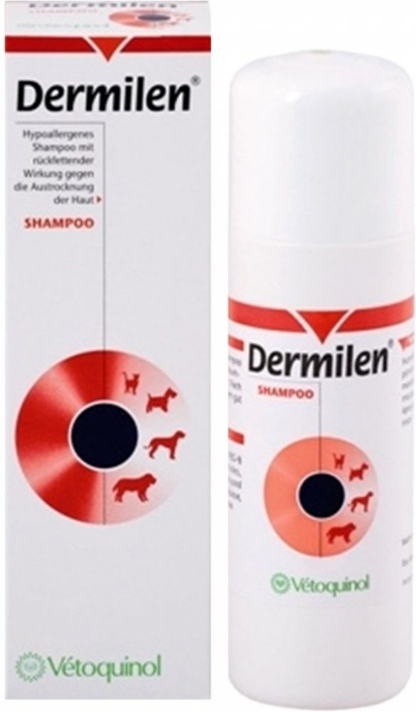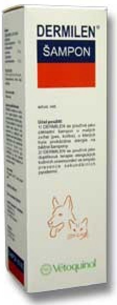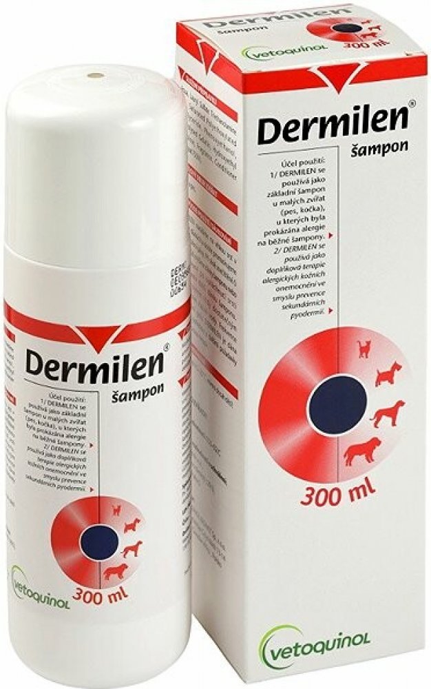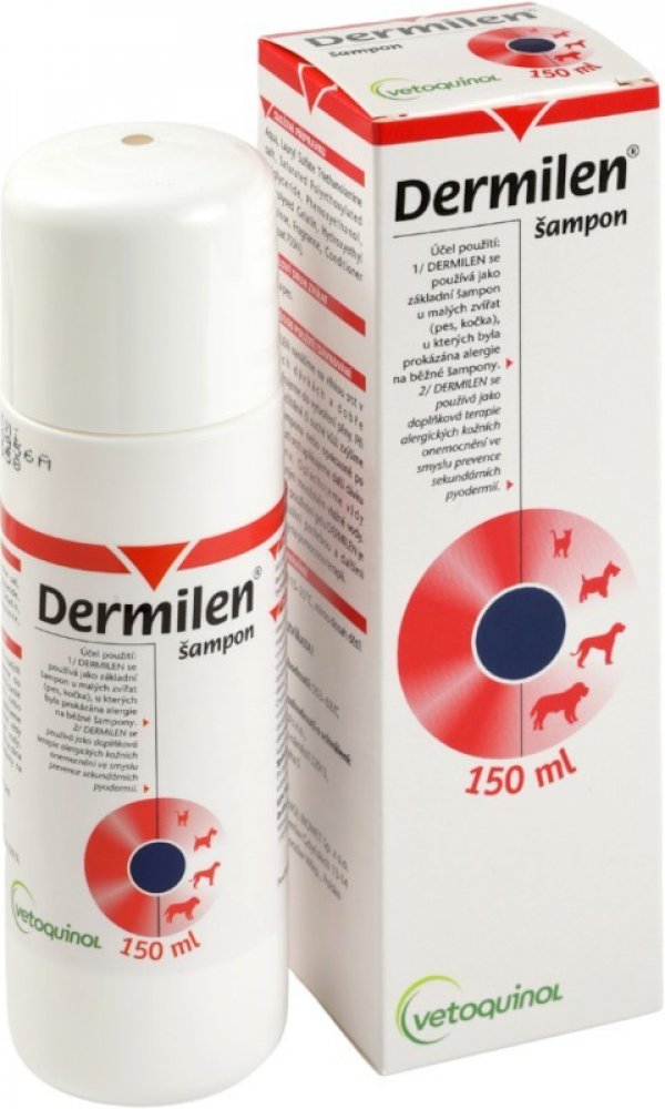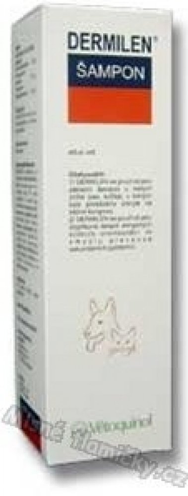 Dermilen šampon Dermilen se používá jako základní šampon u malých zvířat (pes, kočka), u kterých byla prokázána alergie na běžné šampony.