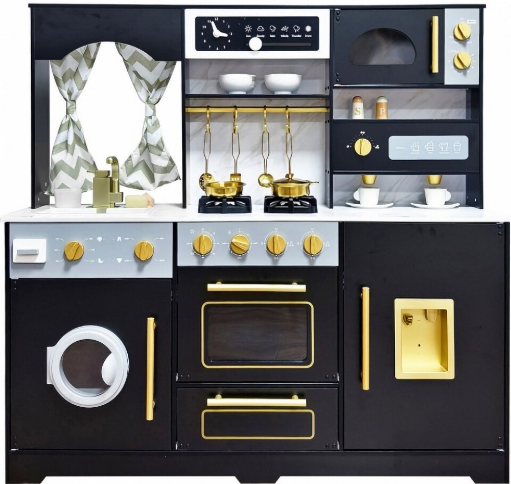 Opravdu jedinečná dětská dřevěná kuchyňka v černo zlatém provedení, se zlatými detaily a doplňky, s okýnkem a velkou spoustou spotřebičů, vychytávek a krásných detailů nadchne děti i rodiče. Tuto kuchyňku budete svému dítěti závidět, může v ní totiž péct, vařit, smažit, prát prádlo, udělat si led do nápoje nebo si přímo z lednice napustit vodu, ohřívat jídlo, připravovat několik druhů kávy a umývat nádobí pod skutečnou, tekoucí vodou. To vše za doprovodu zvukových a světelných efektů (sporák svítí a vydává zvuk vaření), které s funkční vodou dodávají celé hře v kuchyňce reálný nádech. V černé dřevěné kuchyňce budou děti s nadšením trávit celé hodiny. Při hře s touto edukativní hračkou děti zdokonalují motorické dovednosti, manuální zručnost, koordinaci očí a rukou, rozvíjí fantazii, hrají role, budují sociální vazby. Proč vybrat tuto dětskou kuchyňku: