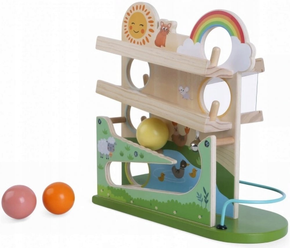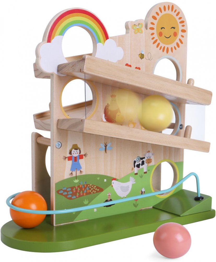 Děti milují objevování, jistě je zaujme pohyb kuliček po stranách skluzavky. Hračka je vyrobena z vysoce kvalitního dřeva a všechny prvky byly pečlivě broušeny a lakovány.