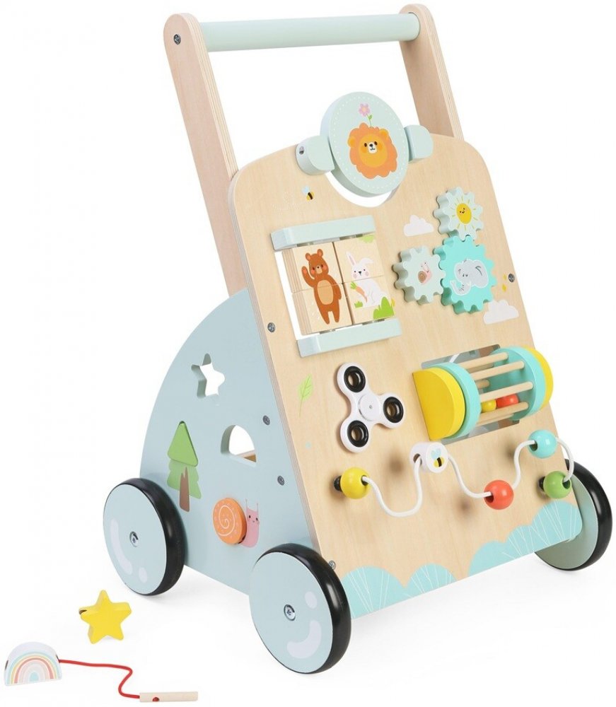 Podporujte první kroky vašeho dítěte hravou formou! Toto dřevěné chodítko kombinuje stabilní podporu při chůzi s množstvím motorických a hracích prvků.