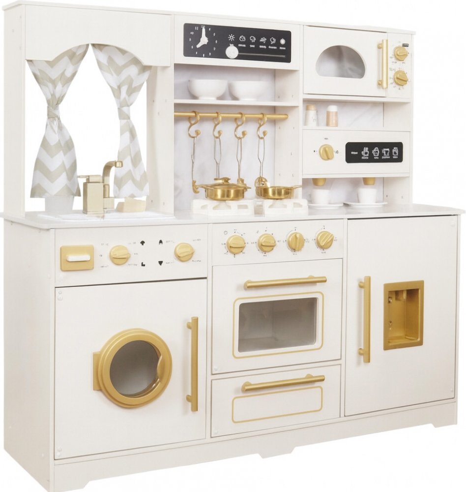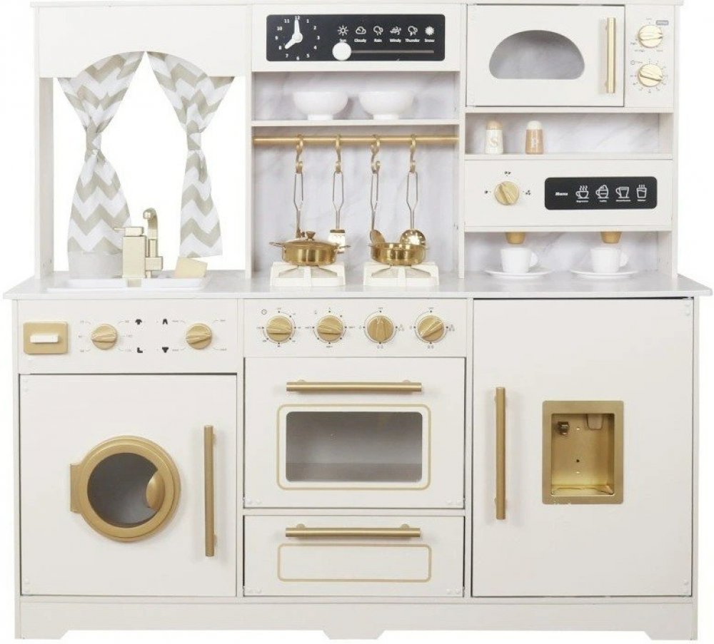 Opravdu jedinečná dětská dřevěná kuchyňka v krémové barvě, se zlatými detaily a doplňky, s okýnkem a velkou spoustou spotřebičů, vychytávek a krásných detailů nadchne děti i rodiče. Tuto kuchyňku budete svému dítěti závidět, může v ní totiž péct, vařit, smažit, prát prádlo, udělat si led do nápoje nebo si přímo z lednice napustit vodu, ohřívat jídlo, připravovat několik druhů kávy a umývat nádobí ...