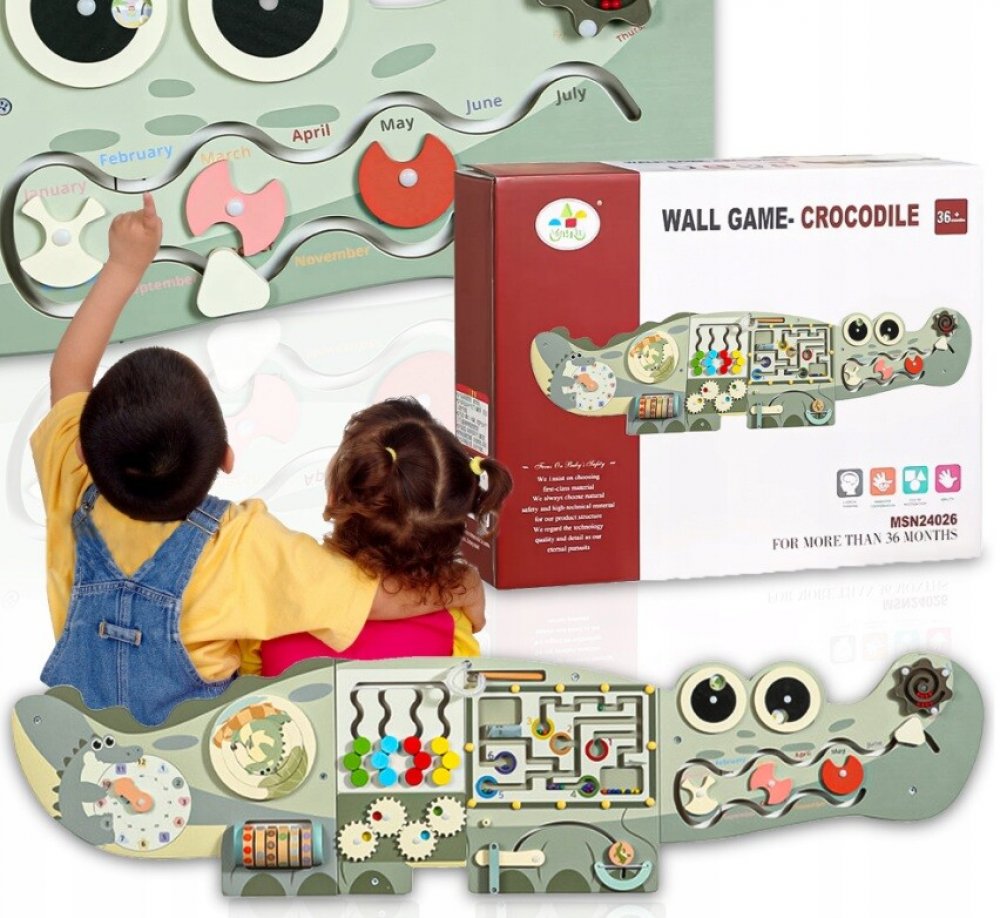 Rozvoj prostřednictvím zábavy! Velká manipulační tabule ve tvaru krokodýla je ideální volbou pro děti, které milují objevování a experimentování. Rozmanité prvky učí trpělivosti, procvičují obratnost a podněcují představivost.