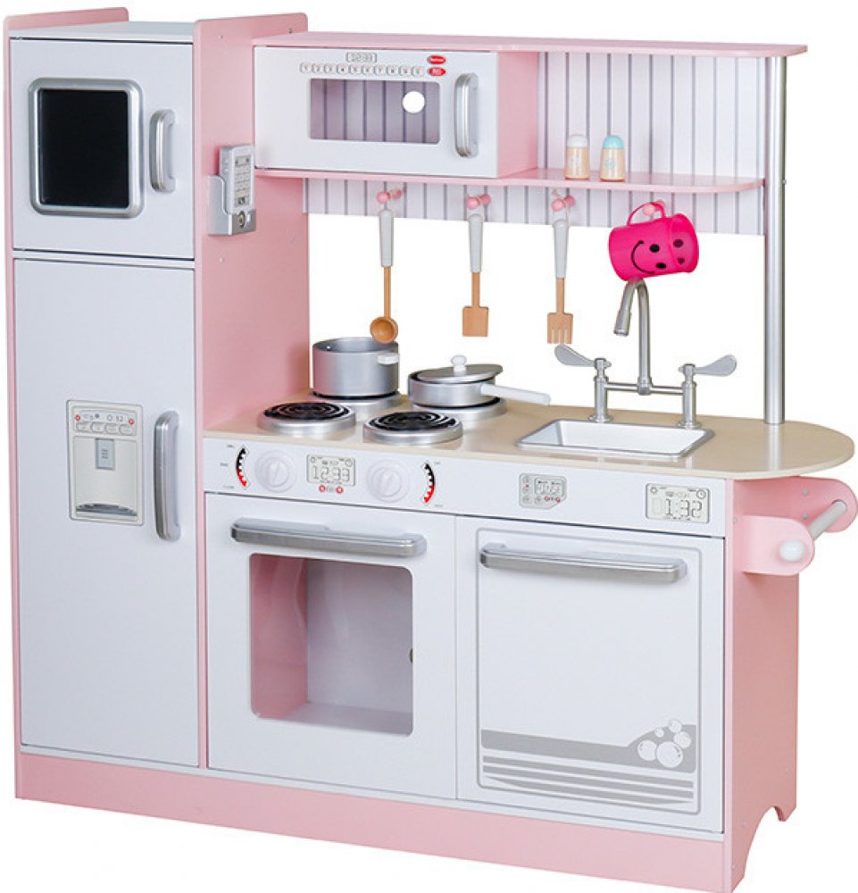 Exkluzivní model dřevěné kuchyňky ve velikosti XXL. Růžový design se kloubí s moderními bílými prvky a elegantním francouzským stylem. Tato kuchyňská sada obsahuje lednici, troubu, myčku, mikrovlnou troubu, tabuli na poznámky, řadu pohyblivých prvků a celou řadou příslušenství - hrnec, pánev, kelímek, telefon, solničky či kuchyňské náčiní na vaření. Jedná se o kvalitní dřevěnou konstrukci, robustní provedení. Děti milují hračky, ...