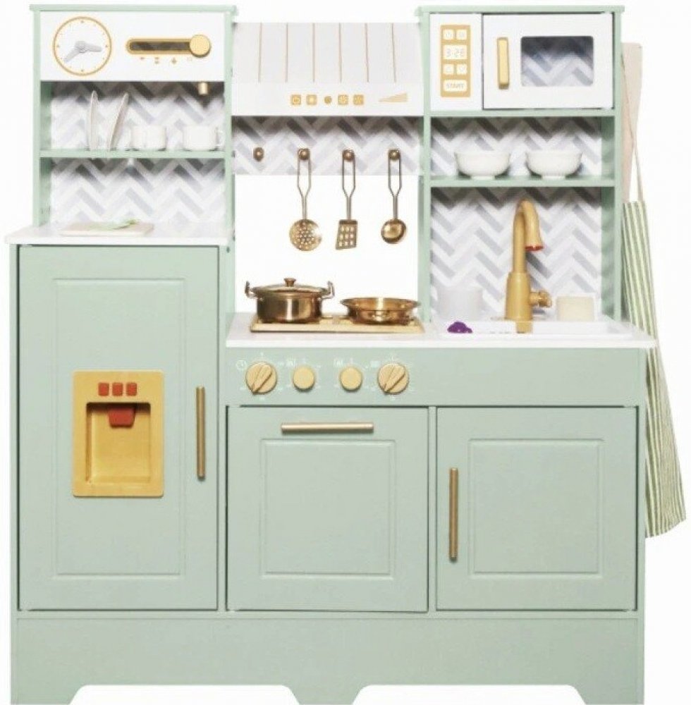 Dětská dřevěná kuchyňka v zelené barvě nabízí realistické funkce, které podporují kreativitu a rozvoj dovedností. Děti mohou péct, vařit, smažit a umývat nádobí pod skutečnou vodou.
