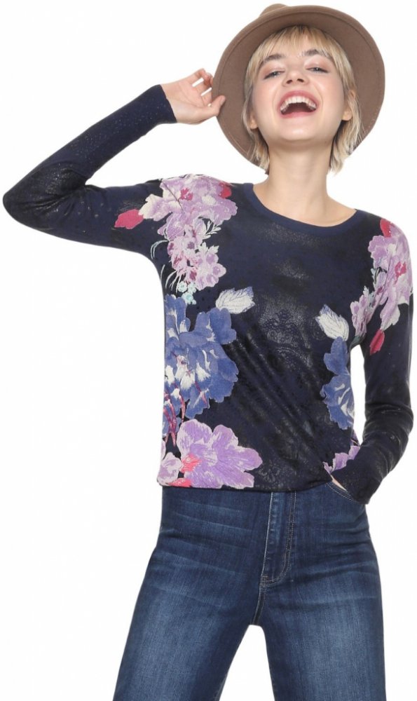 Měkký, jemný a originální dámský svetřík Desigual, který zdokonalují romantické květy oživené několika stříbrnými kamínky.