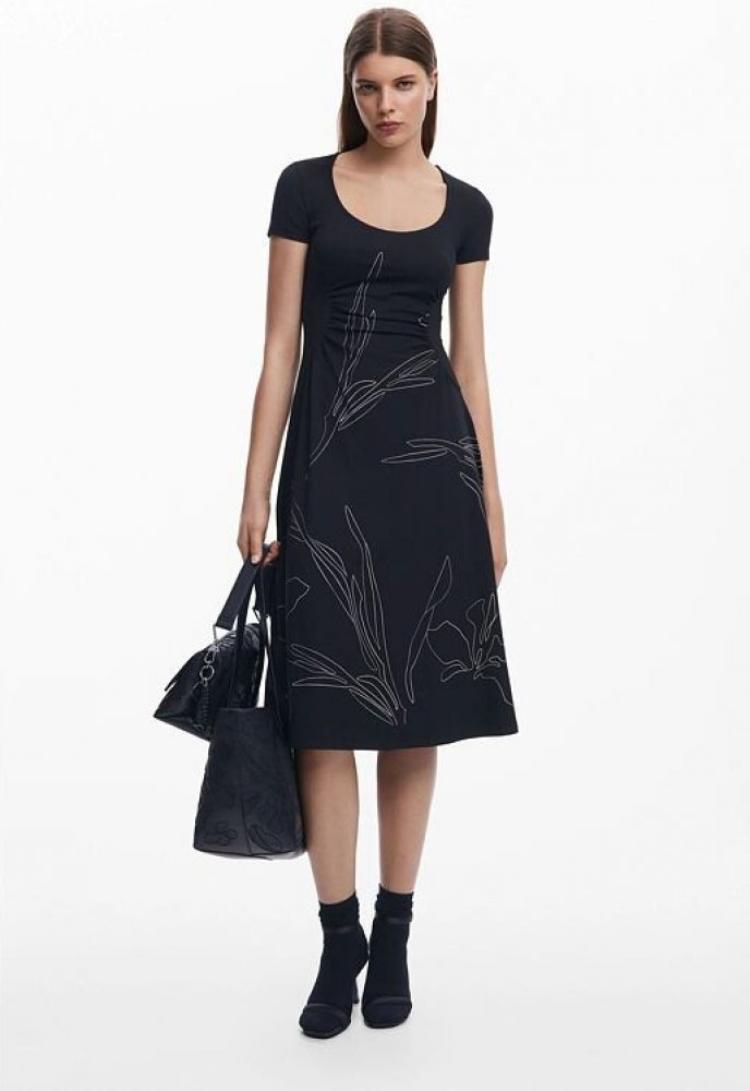 Něžné dámské šaty od značky Desigual. Dlouhé šaty jsou skvělou volbou pro moderní ženu. Pohodlí při nošení zaručuje použitý materiál. Výstřih, upnutá hodní část a volnější střih sukně podtrhnou Vaši ženskost a lehce schovají vaše drobné nedokonalosti. dlouhé dámské šaty černé bílé motivy listů kulatý výstřih přes hlavu krátký rukáv nařasení v bocích optické zeštíhlení v pase velmi pružný a příjemn...