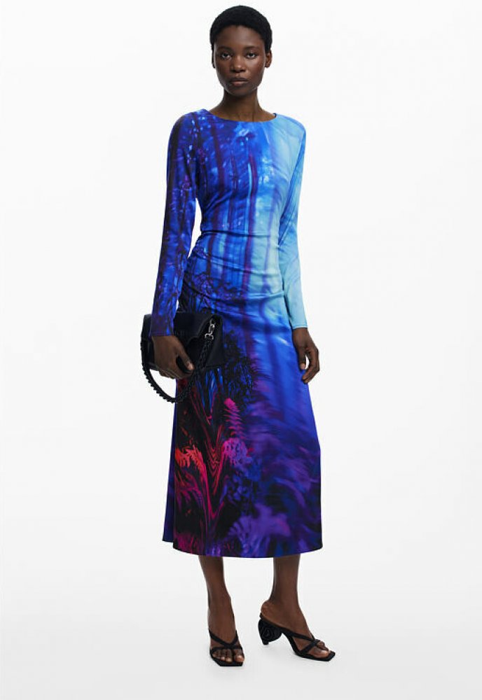 Nádherné dámské šaty Paisajerosa od značky Desigual. Tato šaty Vás osloví svým výrazným krásným motivem, který působí jako umělecké plátno na textilu, a díky asymetrickému lemu a řasení na bocích dokonale obepnou postavu. Dlouhé rukávy a midi délka zaručují variabilitu - od elegantního dne ve městě po stylový večer. dámské modré šaty motiv krajiny v živých barvách střih slim fit kulatý výstřih ke ...