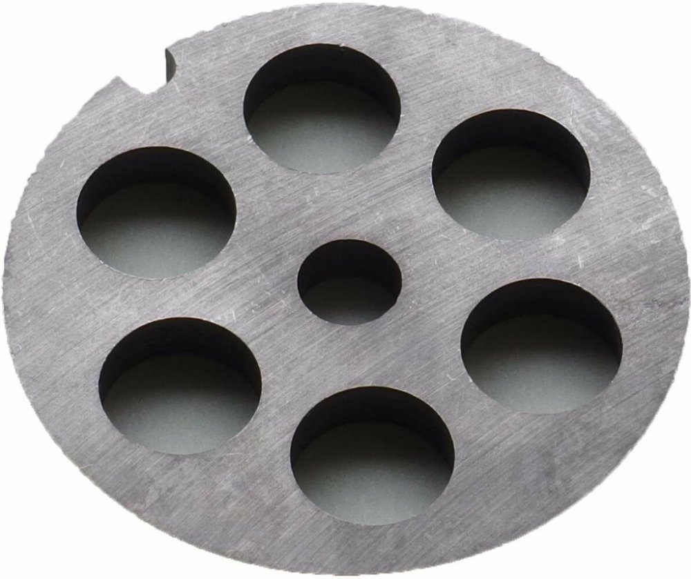 Řezná deska, šajba slouží jako deska do masostrojku na mletí masa, ale i jiných surovin. Velikost otvorů určuje výslednou zrnitost namleté suroviny. Průměr řezné desky 62 mm. Průměr vnitřního otvoru 9 mm. Průměr otvorů - 14 mm. Po použití omyjte, osušte a ošetřete jedlým olejem. Pro zachování co nejdelší životnosti doporučuje výrobce po použití omýt desku teplou vodou, důkladně osušit a skladovat ...