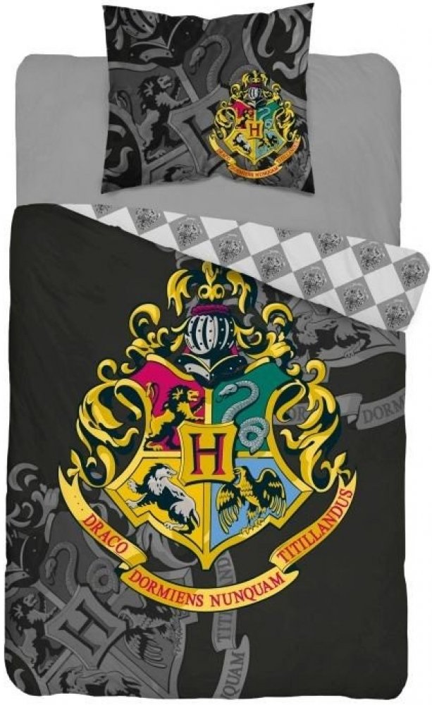 Bavlněné povlečení Harry Potter Black je milým doplňkem do dětského pokoje kluků, kde utvoří útulné místo pro spokojený spánek. Povlečení do velké postele je vyrobeno z příjemné bavlny , která bude svého majitele příjemně hýčkat. Z přední strany povlečení uvidí znak kouzelnické školy. Zadní strana je odlišná s drobným vzorem šedých čtverců. Lůžkoviny jsou laděné do šedo černé v kombinaci se žlutou barvou.