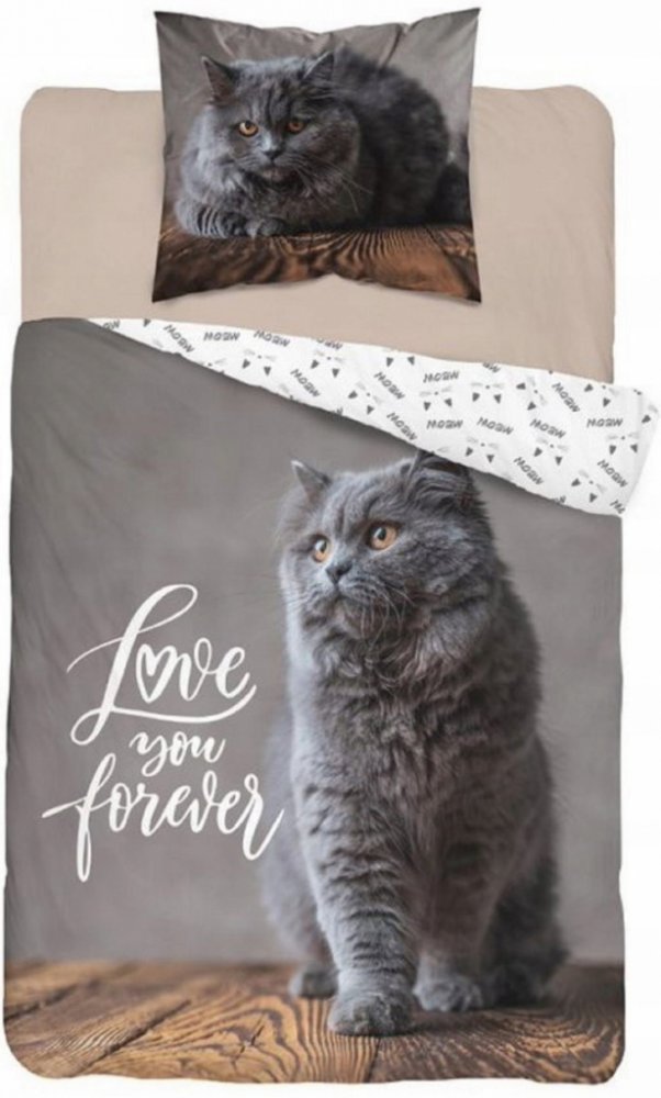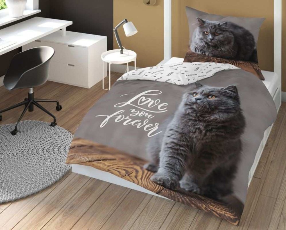 Bavlněné povlečení kočka love je milým doplňkem do dětského pokoje nebo do ložnice rodičů, kde utvoří útulné místo pro spokojený spánek. Povlečení do velké postele je vyrobeno z příjemné bavlny, která bude svého majitele příjemně hýčkat. Z přední strany povlečení uvidí šedé kotě v dřevěném interiéru. Zadní strana navazuje na téma z přední strany a je doplněna drobným vzorem na bílém pozadí viz. foto.