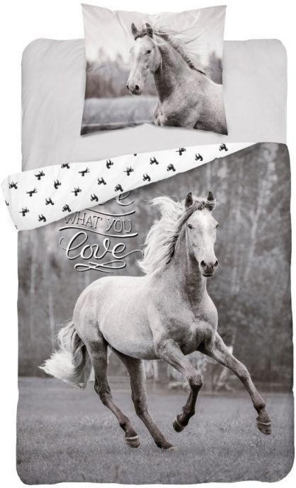 Love kůň klusající na kraji lesa v černo bílé kráse ohromí na dece i na polštáři. Ze zadní strany můžete vidět podklad laděný do bílé barvy s drobným tiskem obrysů koní. Na polštáři vás přivítá z každé strany jiný obrázek. Lůžkoviny jsou měkoučké, prodyšné, zvládají časté praní a žehlení. Bavlna odpovídá normě Oeko-Tex Standard 100 (nezávadnost, stálost barev a rozměrů).