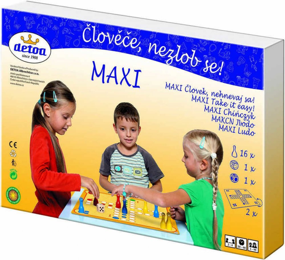 Člověče nezlob se MAXI - je klasická, maxi desková hra pro 2 - 6 hráčů, která trvá přibližně 30 minut a nesmí chybět v žádné domácnosti. Hraj a vyber způsob cety, kterou figurky půjdou. Úkolem každého hráče je projít se svými figurkami po směru šipky na herním plánu celou cestu až na cílová pole, tj. na 4 stejnobarevná pole ve středu herního plánu. Rychlost pohybu určuje počet hozených ok na hrací...