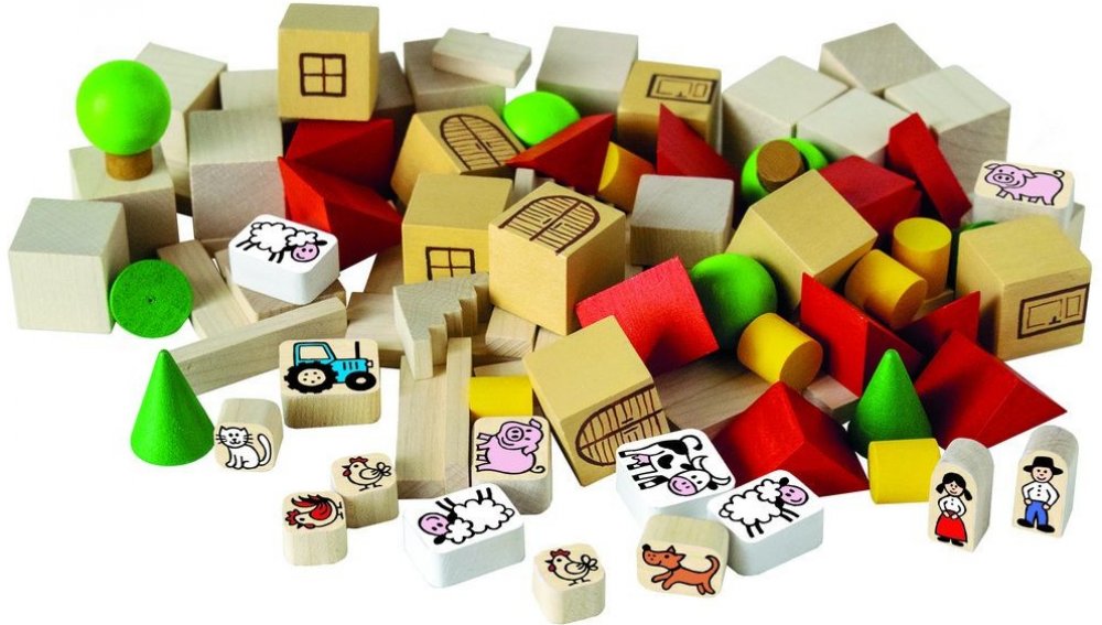 Obsah balení: dřevěné kostky a dílky různých tvarů (postavičky, hospodářská zvířata, vegetace, 4 tématická pozadí ... )