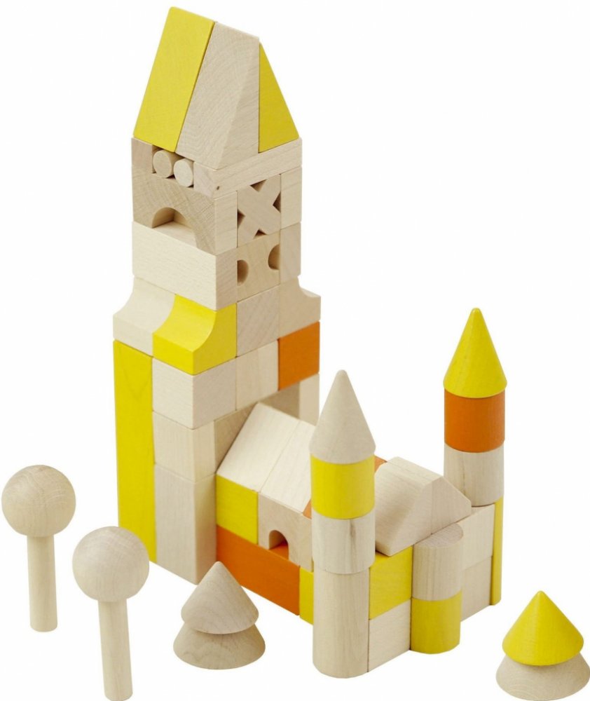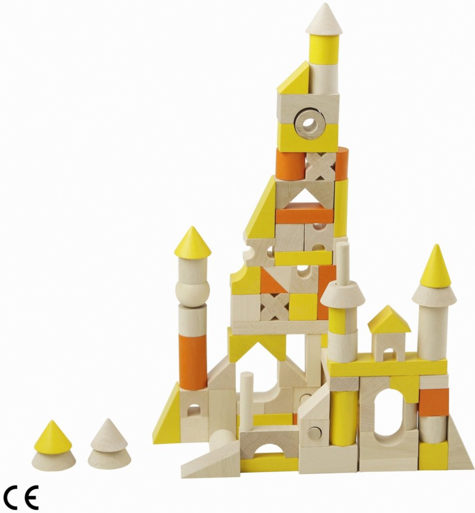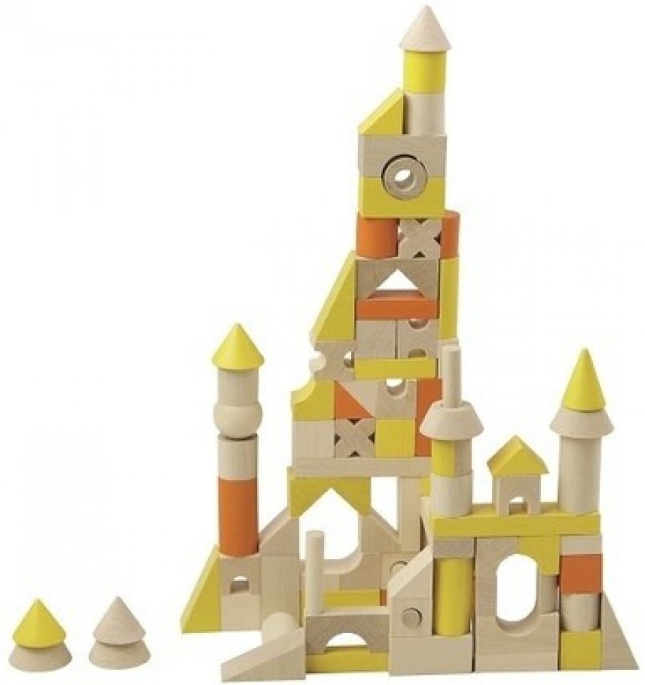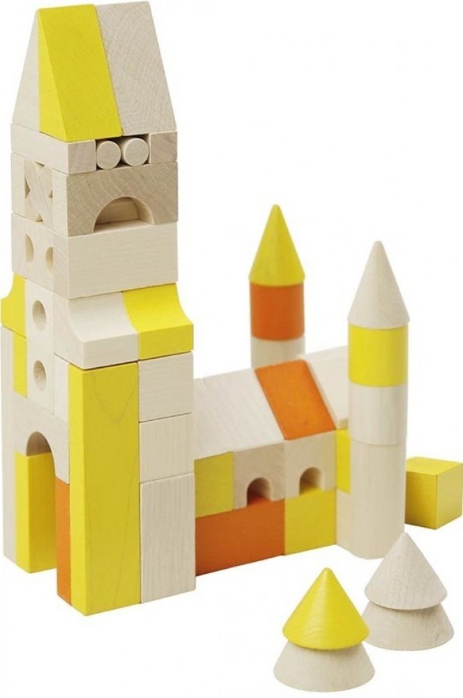 Inovovaná stavebnice skládající se z různých tvarů a velikostí dřevěných dílků v barevném provedení žluto-oranžovém. Kromě klasických krychlí, kvádrů a válečků obsahuje také tyčky, jehlany, "X"ka a další tvary. Některé jsou navíc provrtané. Díky tomu můžete postavit úžasné stavby.