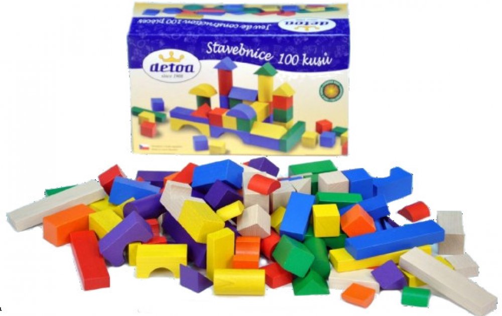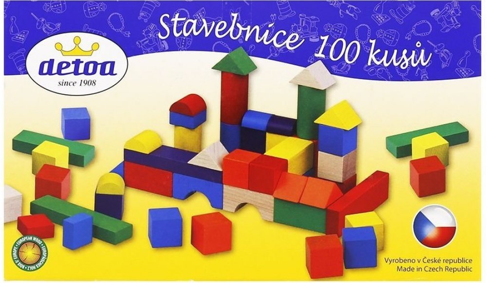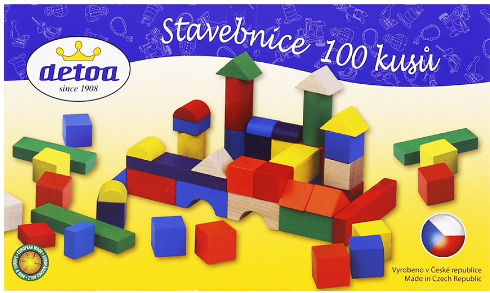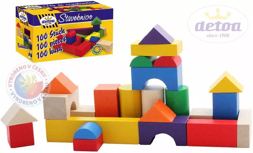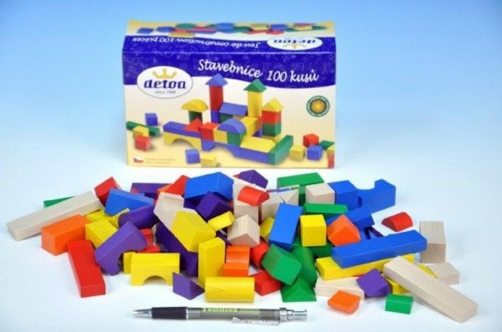 Barevná stavebnice obsahuje 50 kusů dřevěných kostek různých tvarů o velikosti 27 mm.