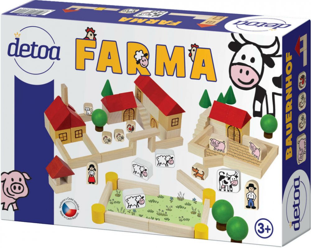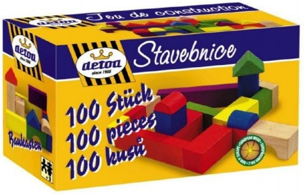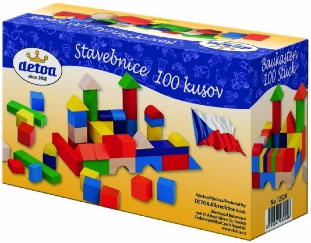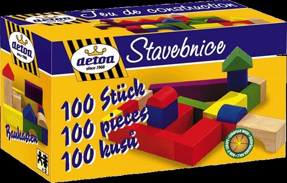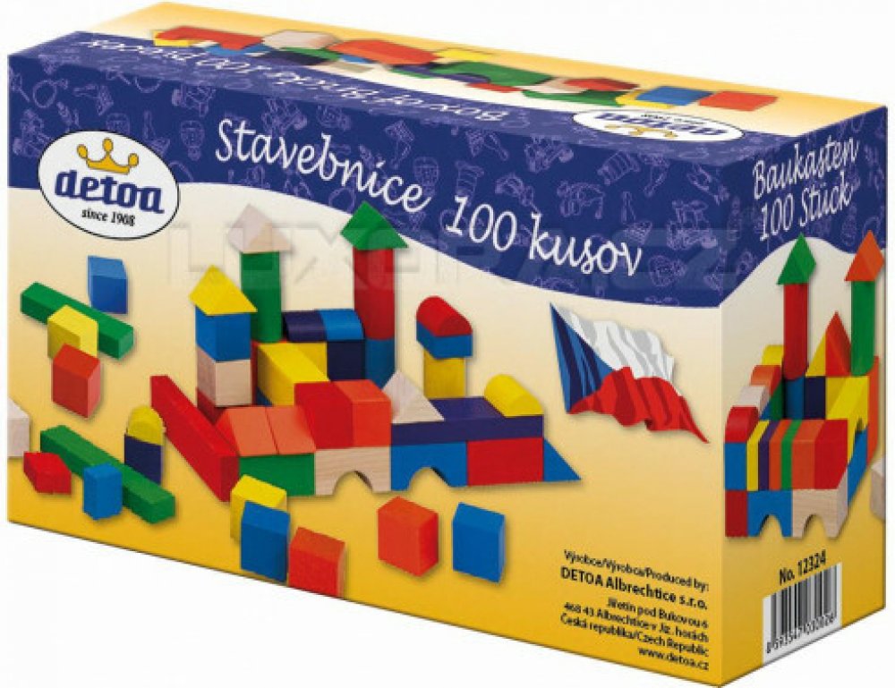 Barevná stavebnice obsahuje 50 kusů dřevěných kostek různých tvarů o velikosti 27 mm.
