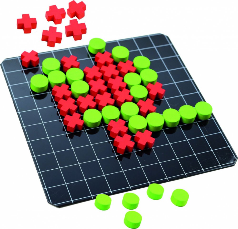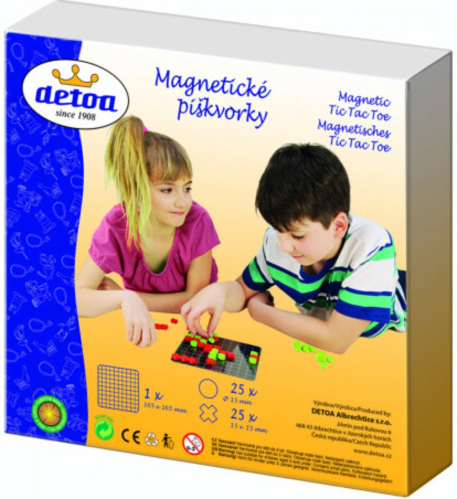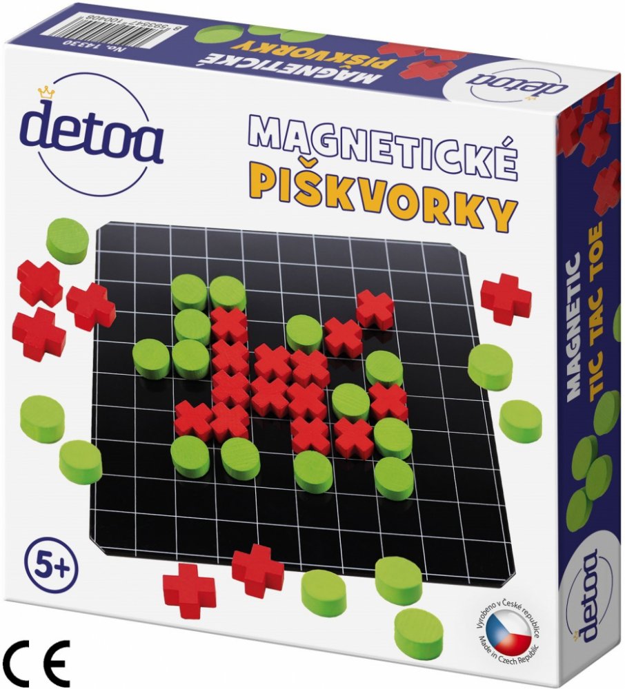 Oblíbená strategická hra pro dva hráče v cestovním provedení. Hra obsahuje plechovou tabulku o roměrech 165x165 mm a dřevěné herní kameny (kolečka Ø 15 mm a kříže 16x16 mm) podlepené magnetem. Baleno v papírové krabici o rozměrech 200x200x37 mm. Varování: nevhodné pro děti do 3 let. Obsahuje malé části. Nebezpečí zalknutí.