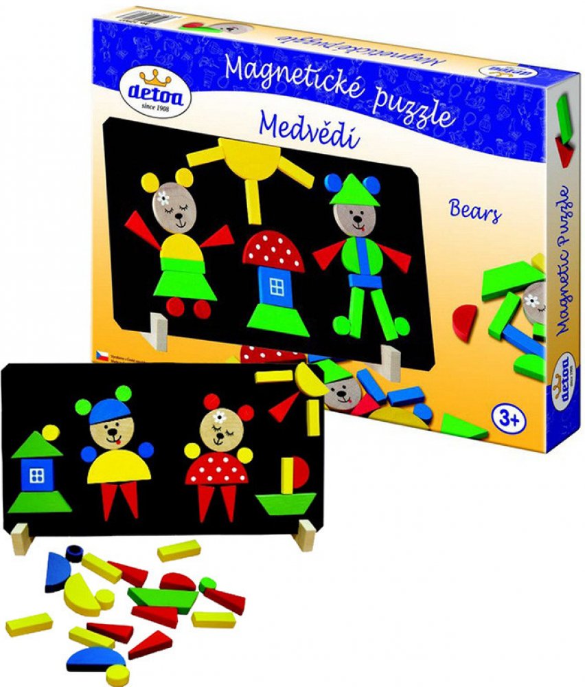 Dětské magnetické puzzle - skládačka. Sada obsahuje magnetickou tabulku a dřevěné magnetky různých tvarů se kterých se skládají medvídci, hříbek, domeček, sluníčko atd. dle fantazie. Veselé barevné magnetické tvary seskládají vaše děti do různých obrazců. Podporuje rozvoj tvořivosti, představivosti a fantazie. Poskládej si obrázky medvídků na magnetické tabuli dle vlastní fantazie.