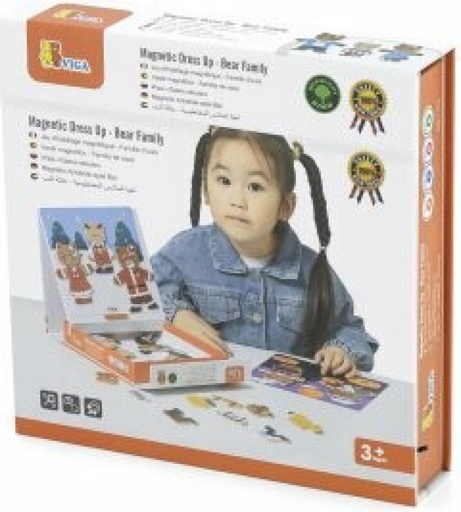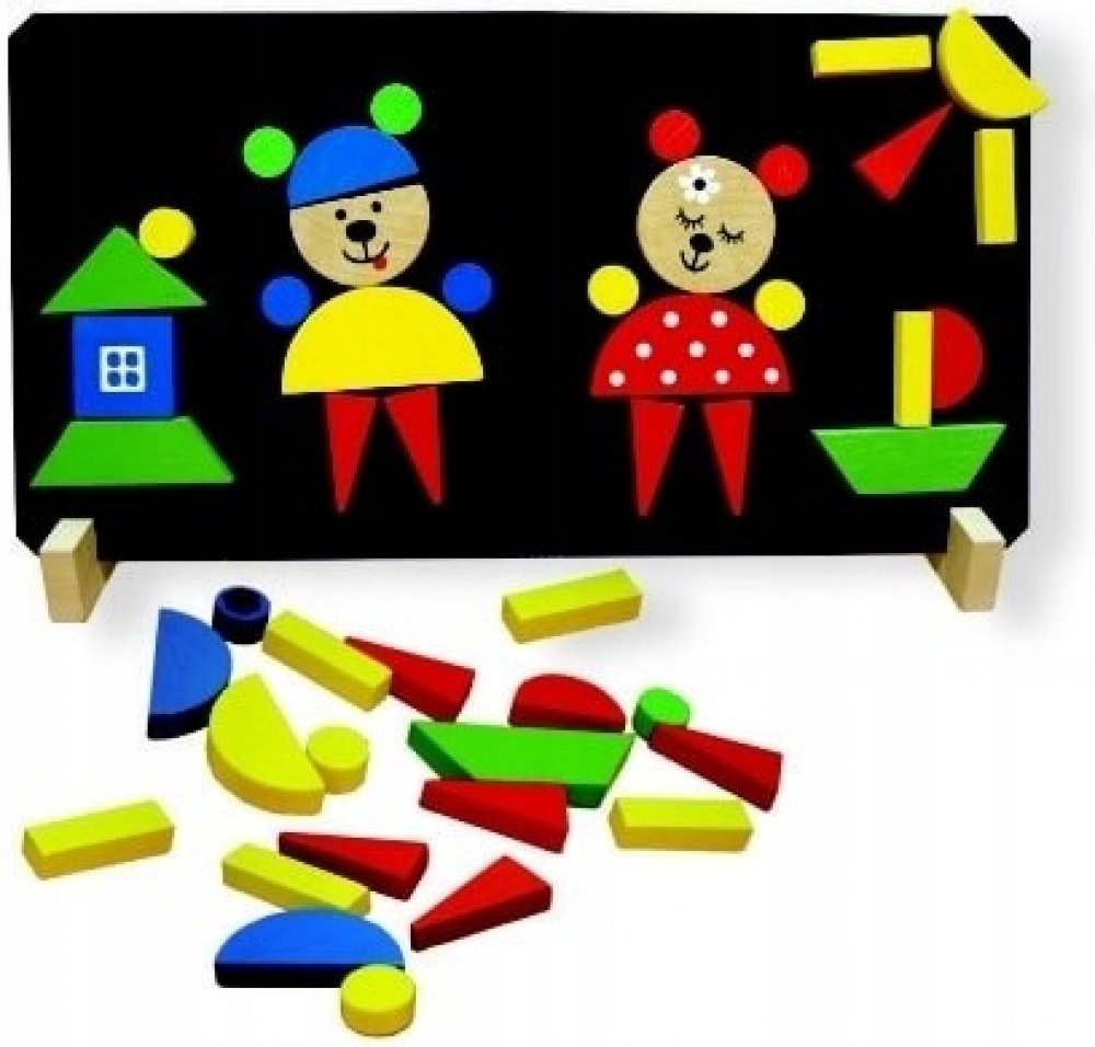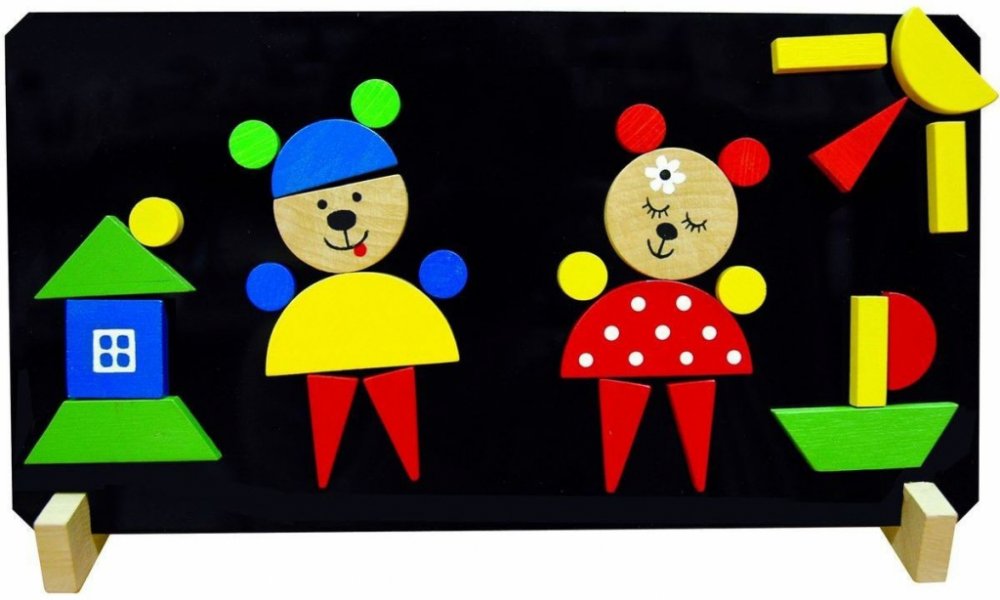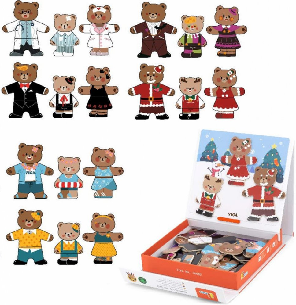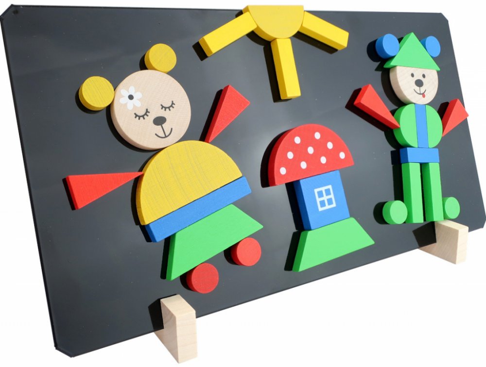 Puzzle medvědi obsahují magnetickou tabulku, stojánek a 37 dřevěných dílků s magnetem, z nichž lze sestavit různé obrázky. Pomáhá rozvíjet jemnou motoriku a představivost dětí. Baleno v krabici z tvrdého papíru.