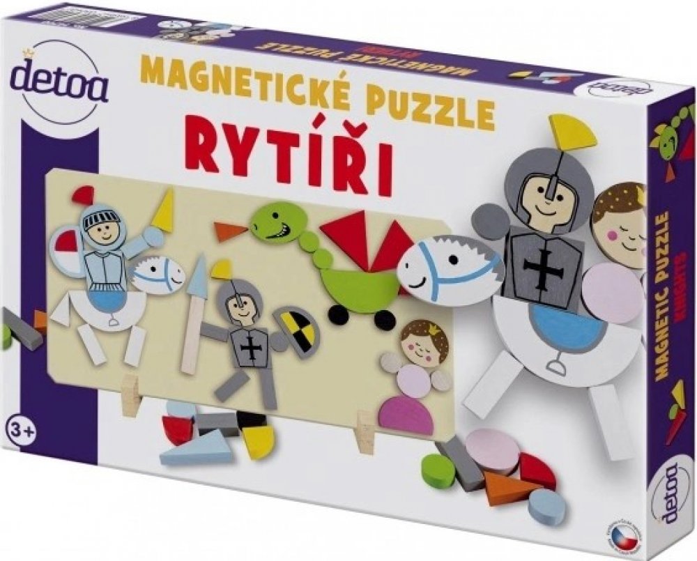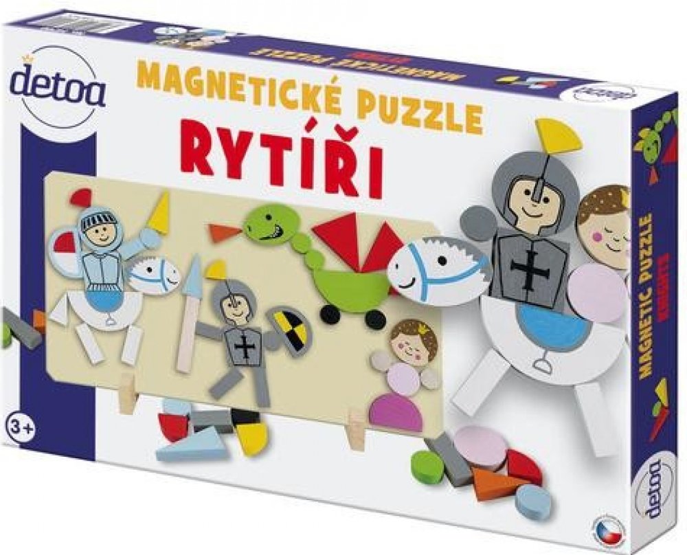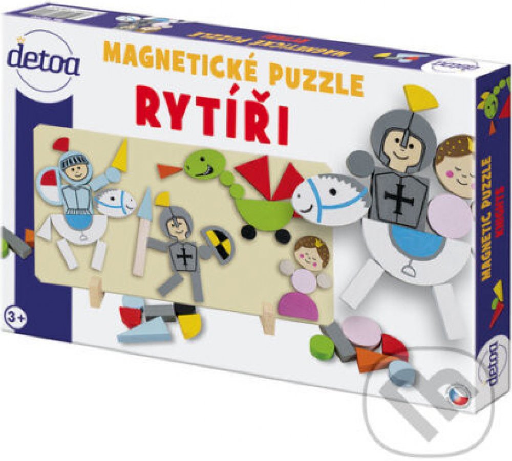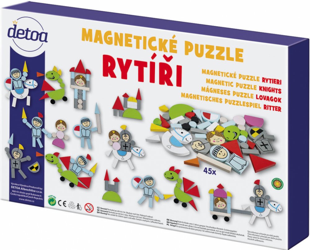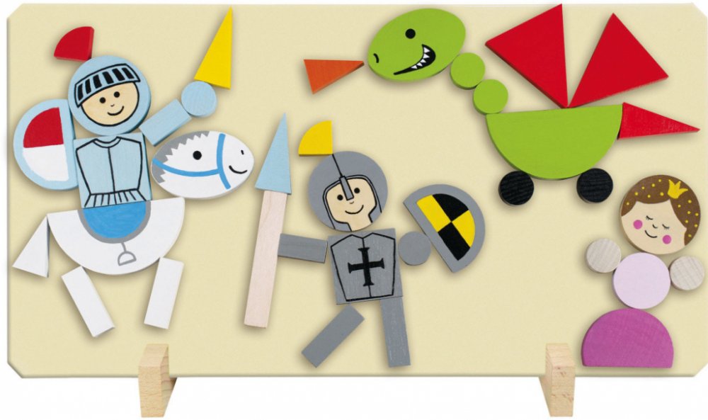 Dřevěné obarvené dílky podlepené magnetky s oblíbeným chlapeckým motivem rytířů. Výrobek obsahuje magnetickou tabulku, stojánky a dřevěné dílky s magnetem, z nichž lze sestavit různé obrázky.