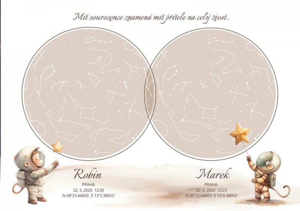 Dvojitá hvězdná mapa narození pro děti Narození miminka je pro každého z nás nejkrásnějším okamžikem. Na počest našich nejmenších jsme pro Vás vytvořili Dvojitou dětskou hvězdnou mapu ideální pro dvojčátka nebo sourozence. S tímto krásným dětským plakátkem dodáte každému dětskému pokojíčku na osobitosti. Dokonalý dárek k narozeninám Dětskou hvězdnou mapou můžete obdarovat své ratolesti k narozeninám, Vánocům, svátku nebo pořídit mapu jako dekoraci do dětského pokoje. Hvězdná mapa narození je ale také krásným a originálním dárkem pro novopečené maminky. Jedná se totiž o dárek od srdce, šitý na míru přesně dle Vašich požadavků. Jak se mapy tvoří Ke každé mapě přistupujeme jako by se jednalo o dárek pro nás, protože právě Vaše spokojenost je pro nás největší odměnou. Za našimi produkty stojí dva lidé, žádní roboti. Nebojte se proto napsat, zavolat. Jsme ochotní a technicky jsme také poměrně obratní. Pomocí počítačové simulace zobrazíme konstelaci hvězd se stoprocentní přesností. Dokážeme vypočítat rozestavení hvězd v minulosti, současnosti, ale také v budoucnosti. Jakékoliv místo je možné. Tisk a dodání Tiskneme na matný papír používaný v galeriích o gramáži 220gsm. Výhodou matného provedení je absence odlesků v prosvětlené místnosti. Papír je FSC certifikovaný, pochází tedy ze zdrojů, které garantují udržitelné hospodaření s lesy. Mapy bez rámu zasíláme v pevných kartonových obálkách/krabicích/tubusech. Pokud si přejete zaslat plakát v tubusu kvůli obdarování, uveďte nám to prosím do poznámky. V případě zakoupení s rámem Vám je rovnou zkompletujeme a Vám tak odpadá jakákoliv práce s další kompletací. Produkty standardně odesíláme do 1-3 pracovních dnů dle vytíženosti.