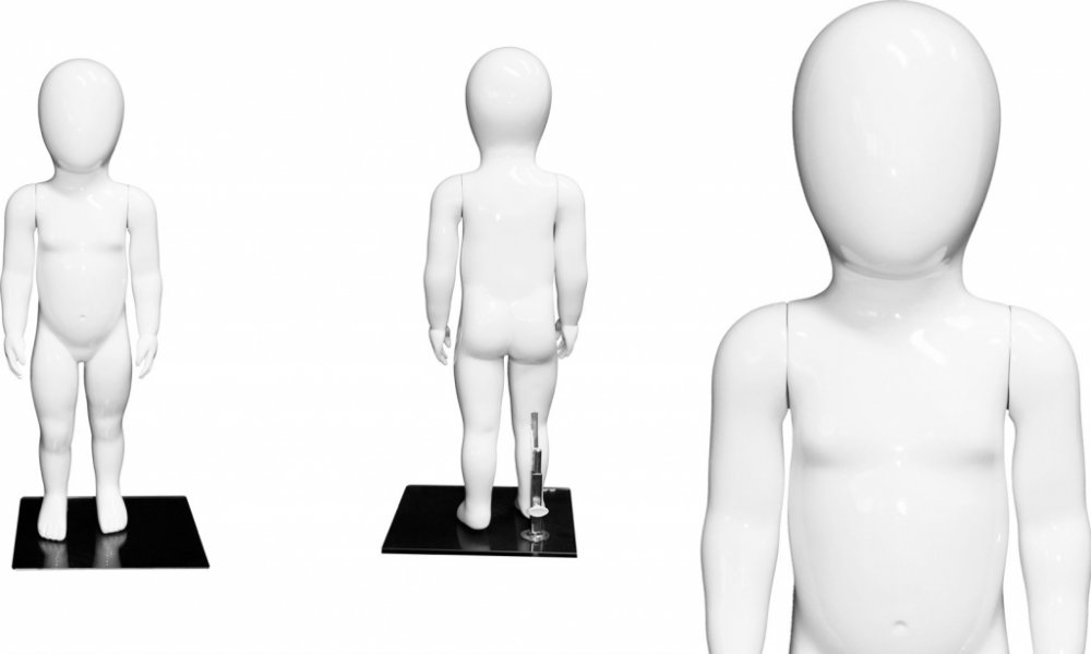 Dětský figurín plné postavy vyrobený ze skleněného vlákna potaženého pryskyřicí, poté sádrou a černým lakem. Dokonale tvarovaná silueta dítěte, které stojí trochu od sebe. Postava se skládá z 5 částí a pevného základu z vysoce kvalitního tvrzeného skla. Lze jej upevnit jak na patě, tak na lýtku, díky čemuž je možné boty vystavit. Před prodejem je každý figurín důkladně zkontrolován a poté zabalen do bublinkové fólie a 5vrstvé lepenkové krabice.