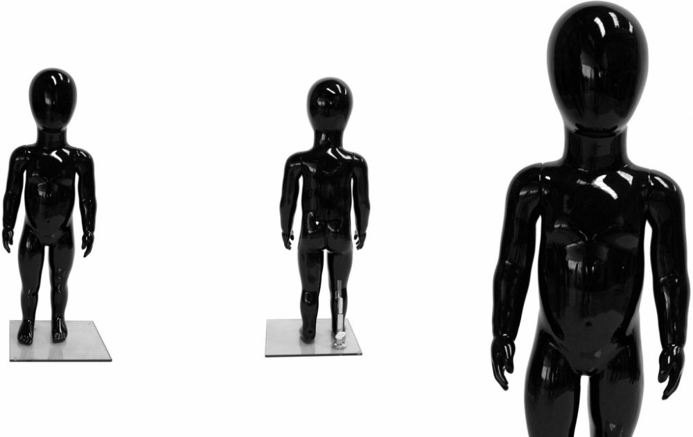 Dětský figurín plné postavy vyrobený ze skleněného vlákna potaženého pryskyřicí, poté sádrou a černým lakem. Dokonale tvarovaná silueta dítěte, které stojí trochu od sebe. Postava se skládá z 5 částí a pevného základu z vysoce kvalitního tvrzeného skla. Lze jej upevnit jak na patě, tak na lýtku, díky čemuž je možné boty vystavit. Před prodejem je každý figurín důkladně zkontrolován a poté zabalen do bublinkové fólie a 5vrstvé lepenkové krabice.