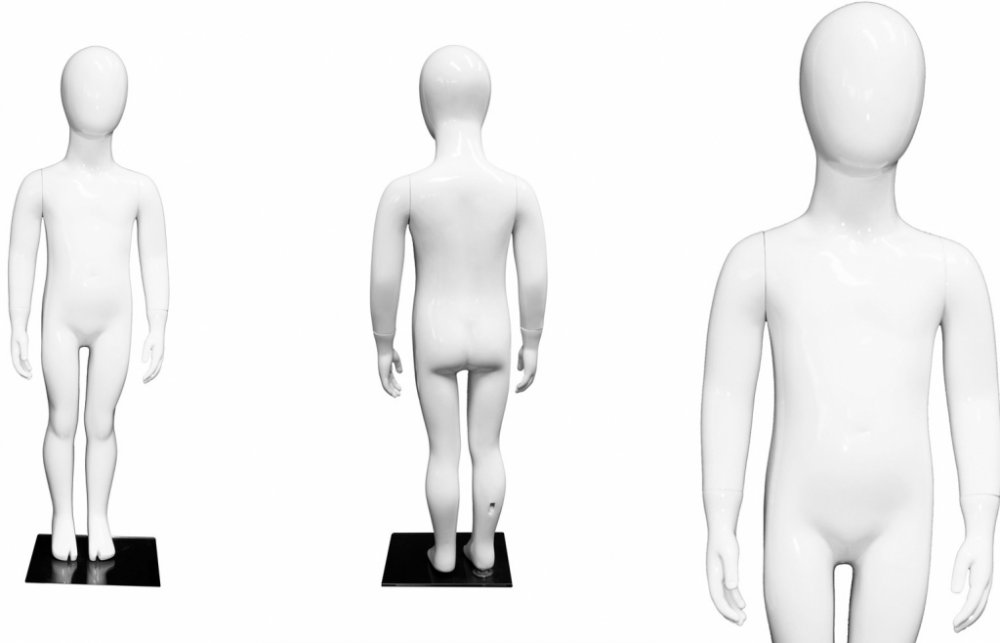 Dětský figurín plné postavy vyrobený ze skleněného vlákna potaženého pryskyřicí, poté sádrou a černým lakem. Dokonale tvarovaná silueta dítěte, které stojí trochu od sebe. Postava se skládá z 5 částí a pevného základu z vysoce kvalitního tvrzeného skla. Lze jej upevnit jak na patě, tak na lýtku, díky čemuž je možné boty vystavit. Před prodejem je každý figurín důkladně zkontrolován a poté zabalen do bublinkové fólie a 5vrstvé lepenkové krabice.