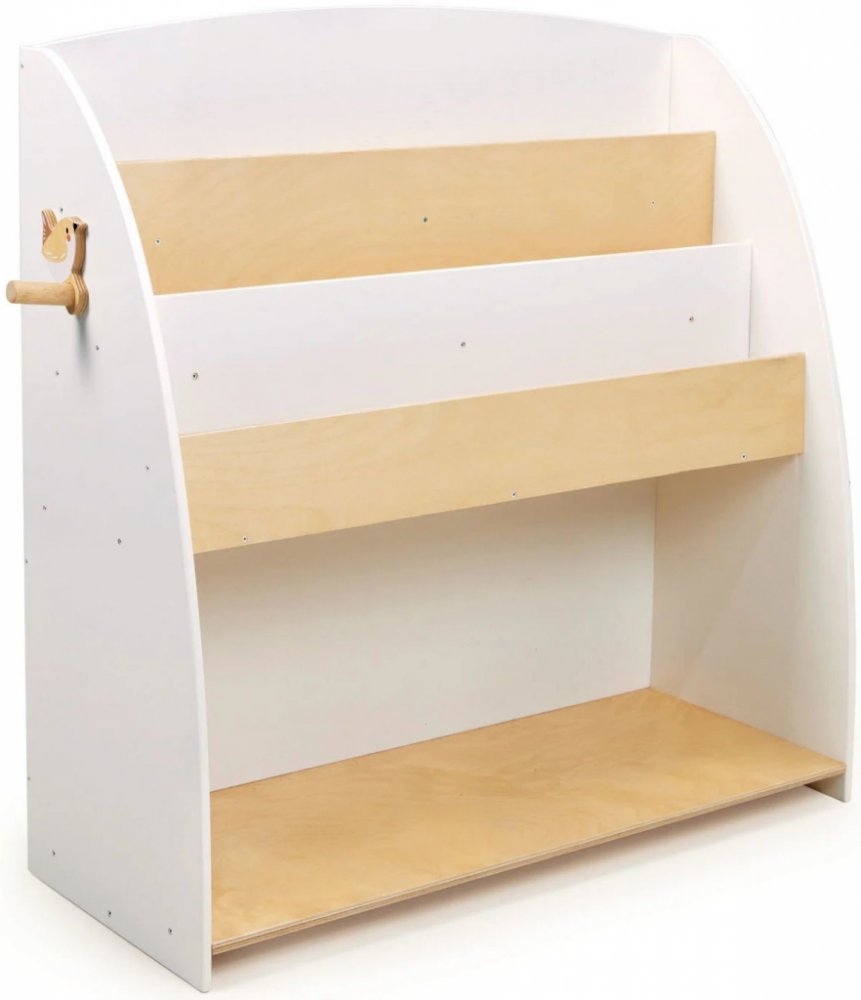 Praktická knihovna vyrobená z překližky v přírodní a bílé barvě s věšákem na boku na zavěšení kabátku nebo pytlíku s hračkami. Ideální pro vystavení a uložení knih nebo hraček.