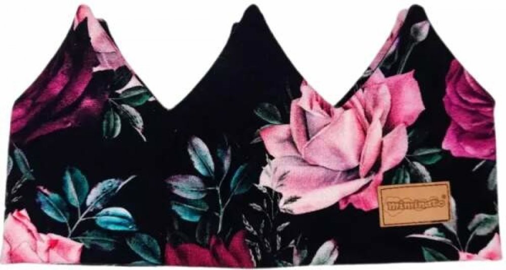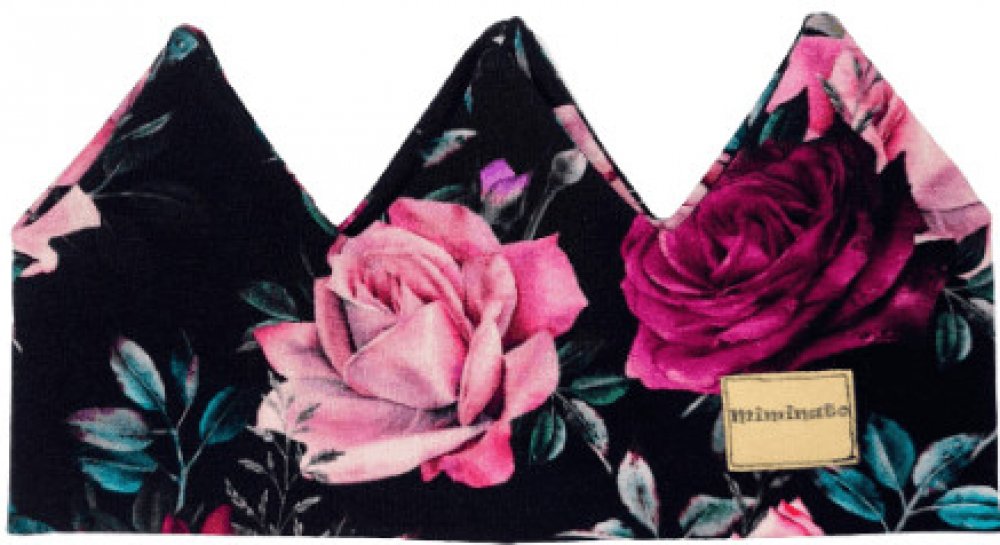 Korunková čelenka růže na černém podkladu. Dětská čelenka chrání uši před větrem, dokonale se hodí do podzimního/jarního počasí.