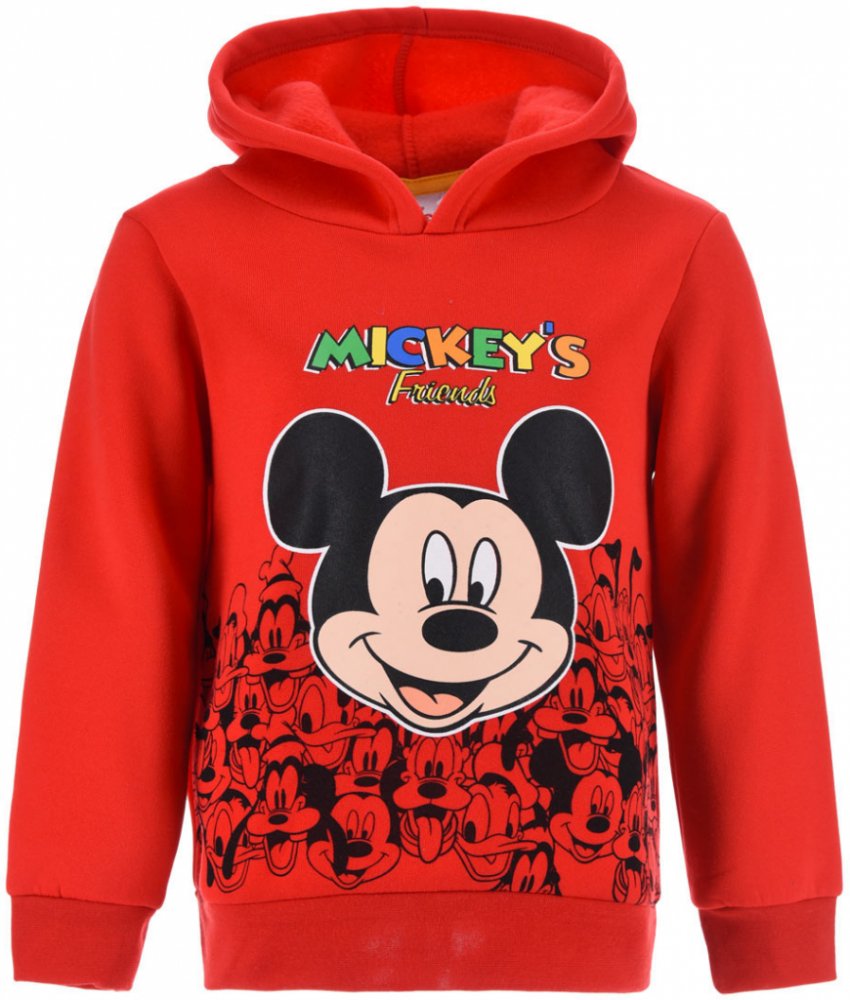 Dětksá mikina s Mickey Mousem a jeho kamarády. S kapucí, bez zapínání. Potisk a nápis na přední straně. Měkká teplákovina s jemným chloupkem na rubové straně.