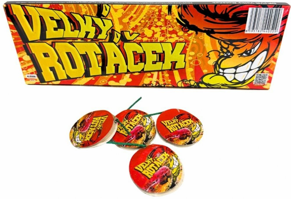 Balení obsahuje 4 kusy velkých rotáčků, které vydávají rotující efekt červené, zelené a žluté barvy. ROTÁČEK se řadí do 1. kategorie a je tedy prodejný od 15 let.