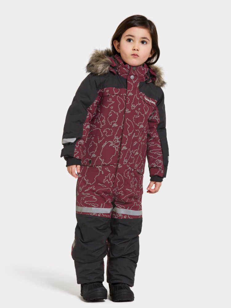 Dětská zimní kombinéza Didriksons Bjarven Grundsund Reflective Wine v tmavě červené/ vínové barvě ze Švédska rozhodně nezklame - vydrží totiž vše! Pro zimní koulovačky a bobovačky stvořený! Dokonce i víc než jednu sezónu vydrží - má totiž rostoucí rukávy a nohavice. Celý potisk je navíc reflexní, takže se nemusíte bát, že by dítě nebylo ve tmě vidět.