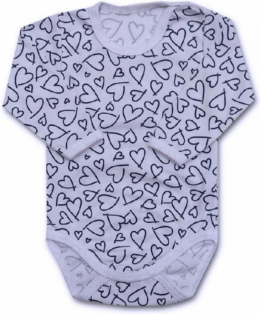 bobynko je vyrobené z příjemné jemné bavlny, zapínání na ramínku i mezi nožičkami na baby druky. Body s obrázky černých srdíček na bílém podkladu.