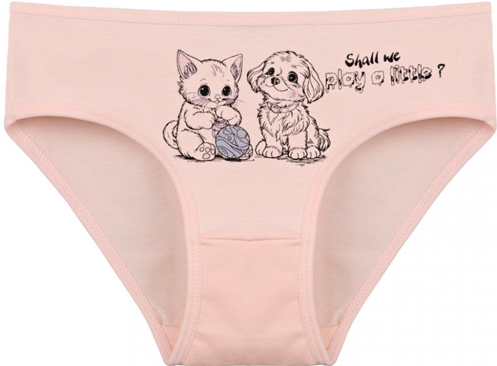 Dětské bavlněné kalhotky Olivia.Dětské bavlněné kalhotky Olivia. Dětské kalhotky klasického střihu jsou pohodlné a slušivé, zdobí je obrázek kotěte se štěňátkem. Obzvláště oceníte materiálové složení - 95% bavlna a 5% elasten. Použitý materiál je příjemný a poddajný na dotek.
