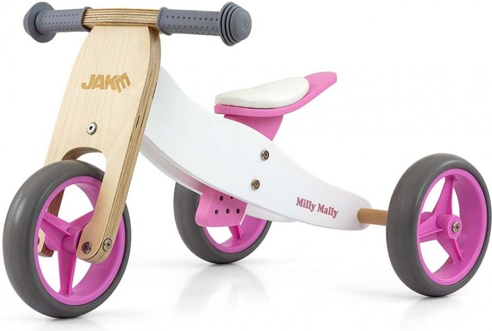 Dětské multifunkční dřevěné odrážedlo Milly Mally JAKE je ideální pro děti, které se právě začínají učí jezdit na kole a přitom nejsou schopné udržet rovnováhu na dvou kolech. Výhodou odrážedla JAKE je, že z tříkolky se snadno stane odrážedlo na dvou kolech.