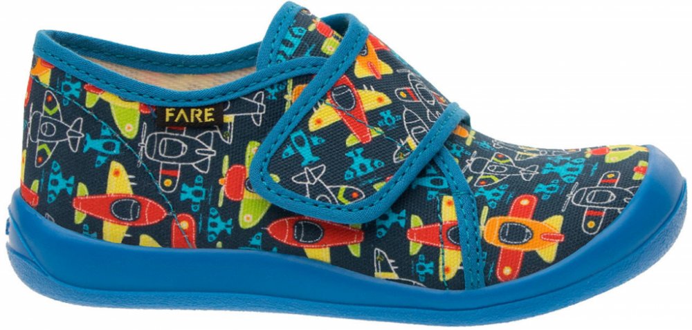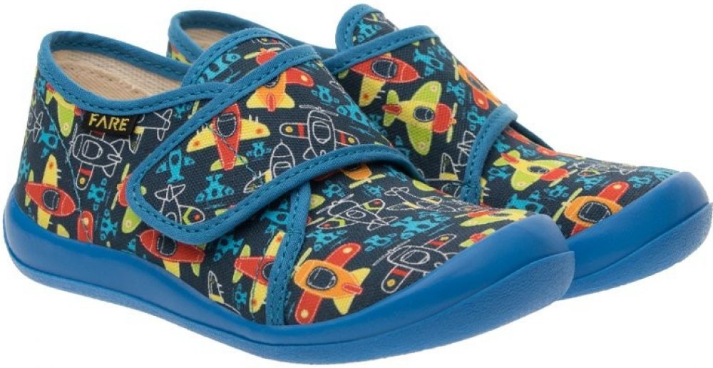 Přezůvková, nízká, textilní, lemovaná obuv na suchý zip. Materiál svršku je z barevného pracího kordu, vnitřek je z bavlněného kepru. Podešev je vyvinuta jako odlehčená, materiál podešve z termoplastického elastomeru, je neklouzavá pro všechny běžně používané podlahoviny. Tato domácí a přezůvková obuv odpovídá ortopedickým požadavkům a zásadám zdravého obouvání. Obuv je v prstové části prostorov...