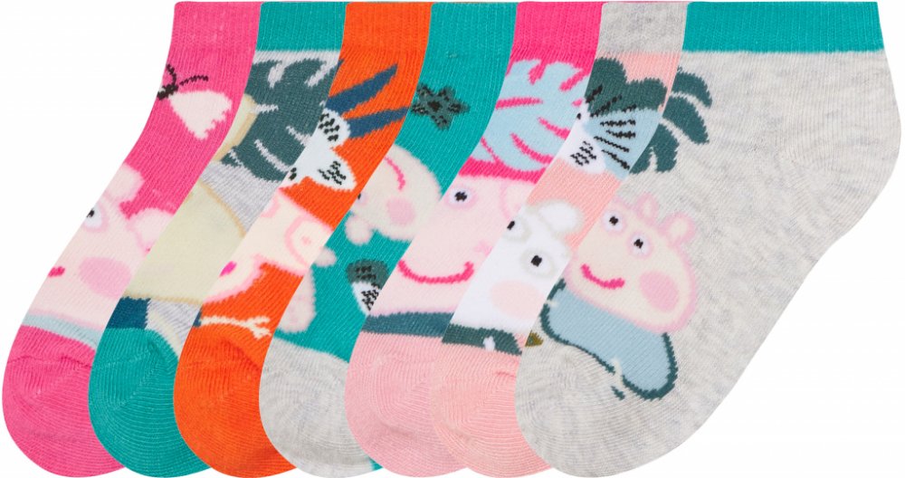 Dětské ponožky, 7 párů Vlastnosti Obsahují bavlnu Skvěle sedí a drží tvar díky značce Lycra ® 7 párů Charakteristika produktu table{width:100%;}td{padding-right: 30px; padding: 0.5rem; border-bottom: 0.0625rem solid #e3e4e5;} tr:nth-child(odd) {background-color: #F2F3F4;} Barva: růžová/šedá/oranžová/tyrkysová/růžová; tyrkysová/modrá/šedá/bílá Vzor: Prasátko Peppa Detail: - Multipack: 7 párů Materi...