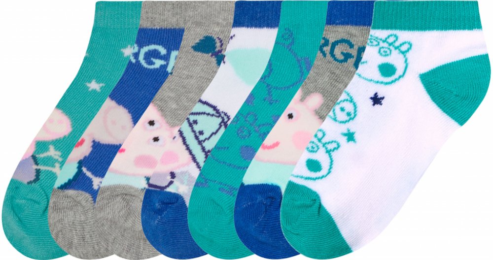 Dětské ponožky, 7 párů Vlastnosti Obsahují bavlnu Skvěle sedí a drží tvar díky značce Lycra ® 7 párů Charakteristika produktu table{width:100%;}td{padding-right: 30px; padding: 0.5rem; border-bottom: 0.0625rem solid #e3e4e5;} tr:nth-child(odd) {background-color: #F2F3F4;} Barva: růžová/šedá/oranžová/tyrkysová/růžová; tyrkysová/modrá/šedá/bílá Vzor: Prasátko Peppa Detail: - Multipack: 7 párů Materi...