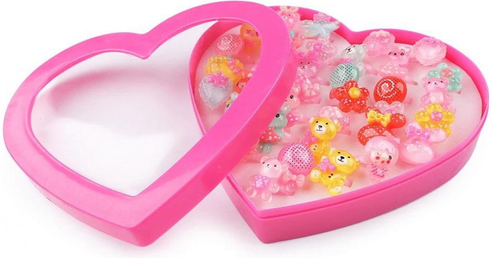Mix dětských prstýnků se srdíčkem. Prsteny jsou ozdobené plastovým kamenem, který v dětských očích vypadá jako zářivý drahokam. Mix dětských prstýnků je zabalený v plastové srdcové kazetě, která má průhledné plastové víko. Je ideální na prodejní prezentaci. Prsteny jsou ozdobené barevnými 3D ozdobami s různými motivy a potiskem, u dětí jsou velice oblíbené.Zadní strana prstýnku je otevřená, mají u...