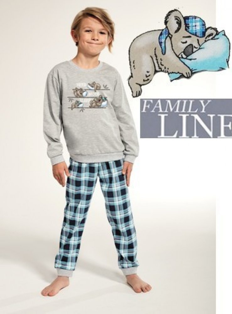 Tričko, s dlouhým rukávem, na přední straně zdobeno milým obrázkem spících medvídků Koala, nápis: Need More Sleep. Dlouhé kalhoty, s károvaným vzorem. Výstřih, manžety rukávů, spodek trička i kalhoty, jsou zakončeny pružným patentem.