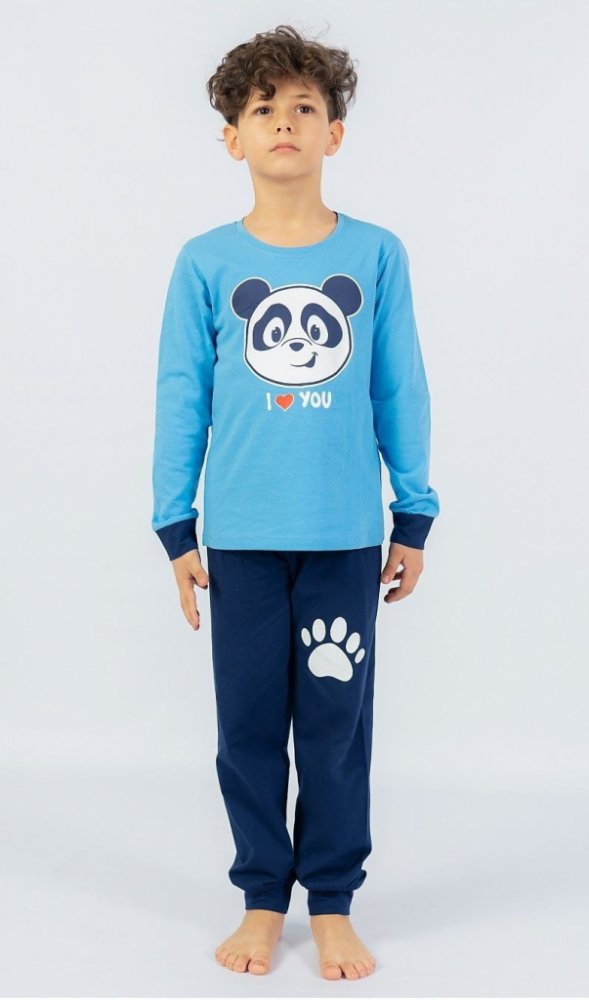 Dětské bavlněné pyžamo dlouhé I love you. Dětské pyžamo se skládá z trika s dlouhým rukávem a dlouhých kalhot. Na jednobarevném triku je veliká pandí hlava a nápis 'I love you'. Na jednobarevných kalhotách, které jsou zakončeny panty, je otisk pandí tlapky. Kalhoty mají v pase gumu, nemají kapsy. Použitý bavlněný materiál je příjemný a poddajný na dotek.