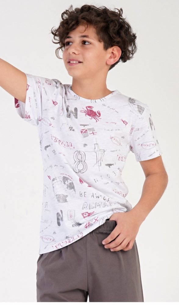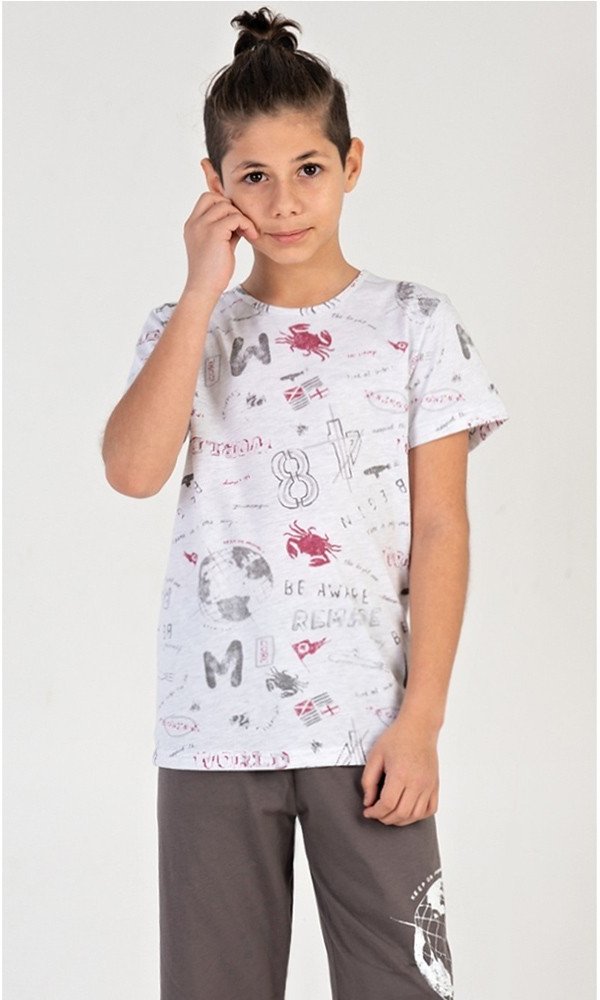 Dětské kapri pyžamo Jakub.Dětské chlapecké kapri pyžamo Jakub. Dětské pyžamo se skládá z trička s krátkým rukávem a tříčtvrtečních kalhot. Tričko je potištěno motivy moře a cestování. Jednobarevné kapri kalhoty mají v pase gumu, šňůrku na stažení a nemají kapsy. Použitý bavlněný materiál je příjemný a poddajný na dotek. Obsah bavlny u trička je 70% a u kalhot 100%.