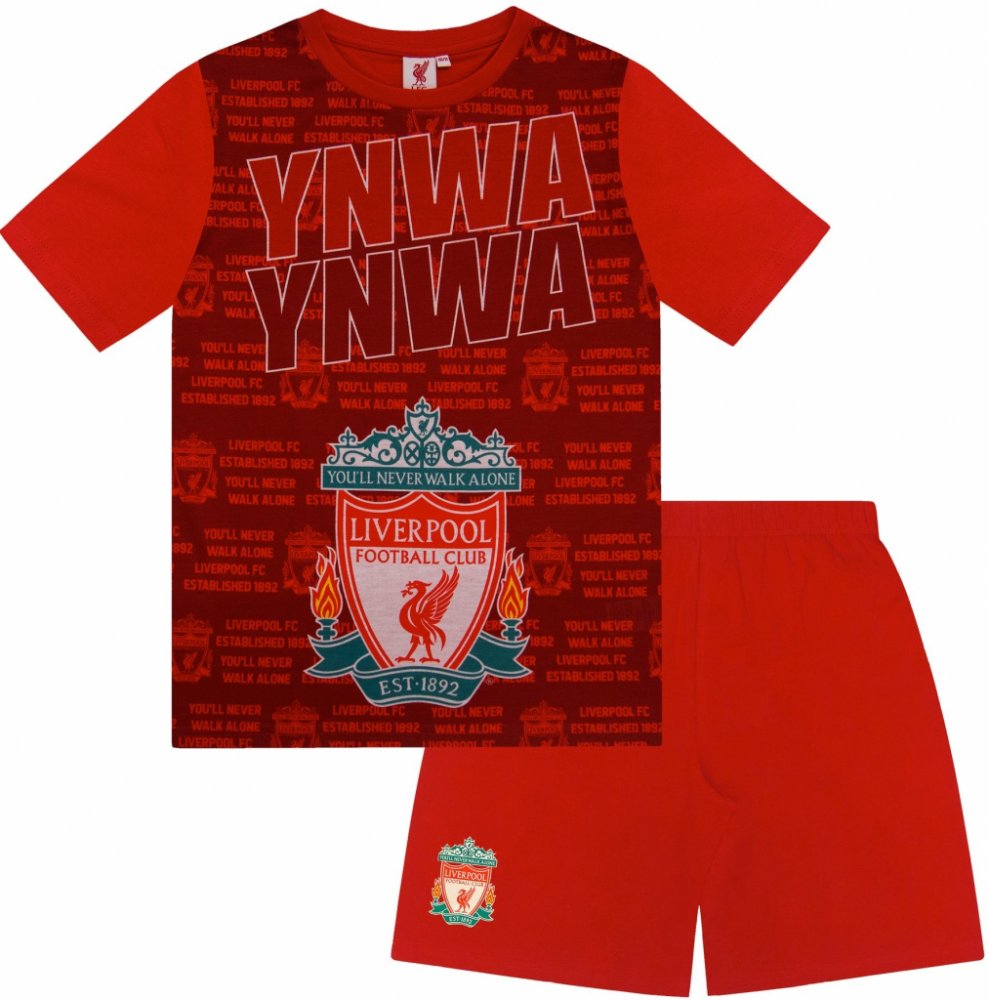 Dětské pyžamo Liverpool FC v červené barvě. Krátký rukáv i nohavice. Barevný znak a nápis zepředu. Elastický pás. Prvotřídní materiál.