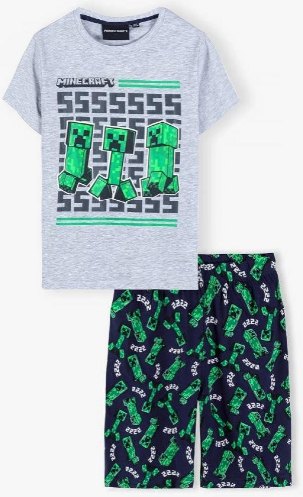 Dětské pyžamo MINECRAFT, šedé triko a tmavě modré kraťasy. Na triku a kraťasech je hlavní postava ze hry Minecraft - Greencreeper.