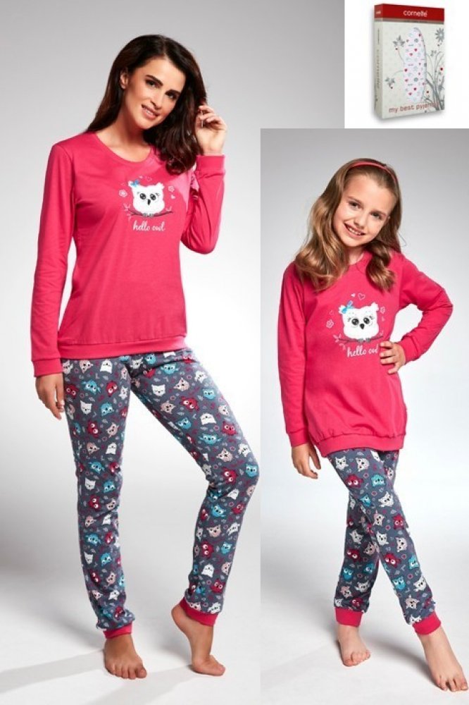 Pohodlné dětské pyžamo, s dlouhým rukávem. Na přední straně zdobeno aplikací Sova, z jemného materiálu, imitujícího jemná pírka, a se skutečnou mašličkou. Kalhoty dlouhé, se vzorem sovičky. Výstřih, manžety rukávů, spodek trička i kalhot, jsou zakončeny elastickým patentem.