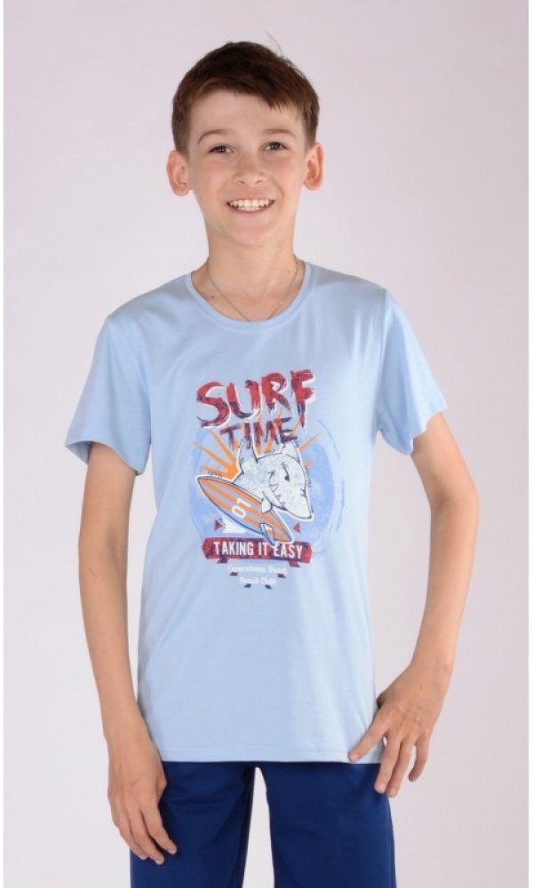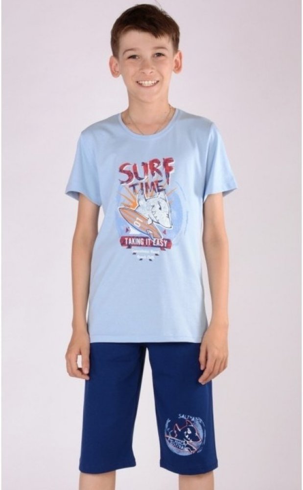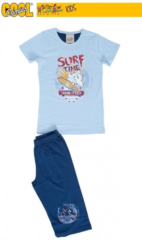 Dětské bavlněné kapri pyžamo Žralok. Pyžamo tvoří tričko s krátkým rukávem a kapri kalhoty. Tričko zdobí potisk žraloka. Kapri kalhoty mají v pase gumu a jsou jednobarevné. Bavlněný materiál je poddajný a jemný na dotek. Pyžamo je vhodné i na denní nošení.