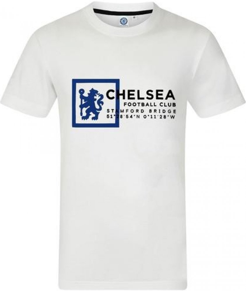Bílé dětské tričko Chelsea FC s netypickým designem na hrudi - klubový znak v rámečku, název klubu a stadionu, souřadnice stadionu.Příjemný materiál, který se bude pohodlně nosit ke každé příležitosti.Barva: bíláMateriál: 100% bavlnaOficiální produkt.