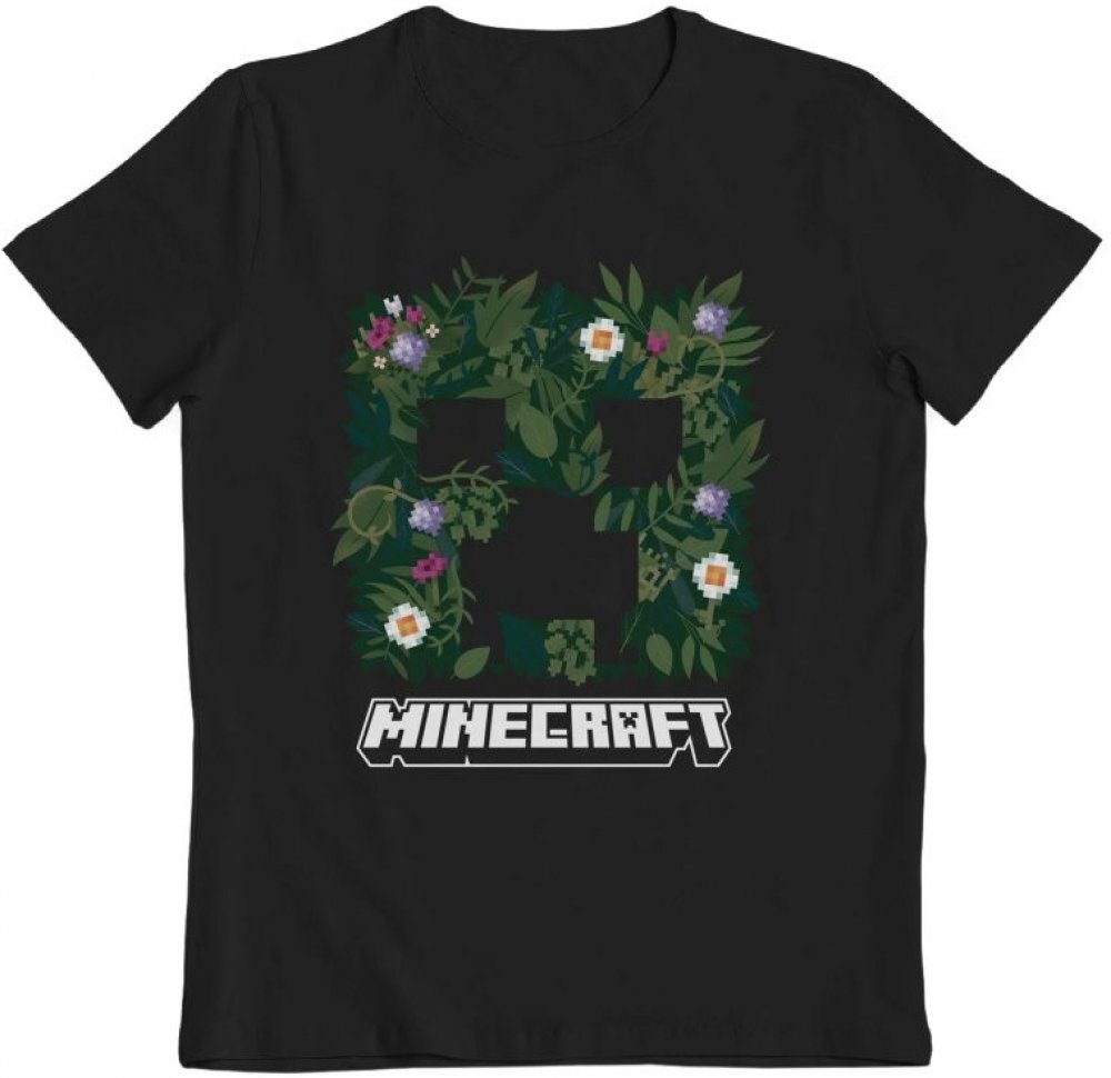Černé atraktivní dětské tričko s grafickým potiskem postavy Creepera s kvetinovým designem. Tričko je vhodné pro všechny hráče a fanoušky Minecraftu.