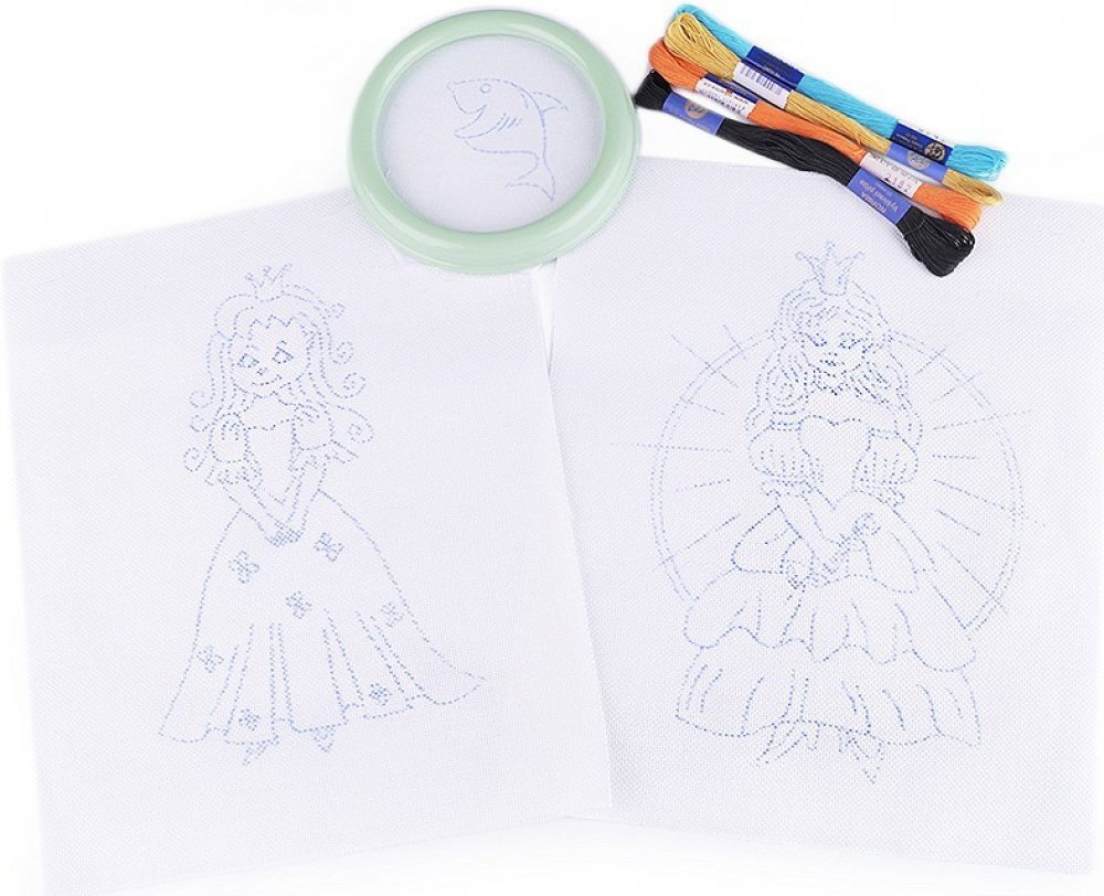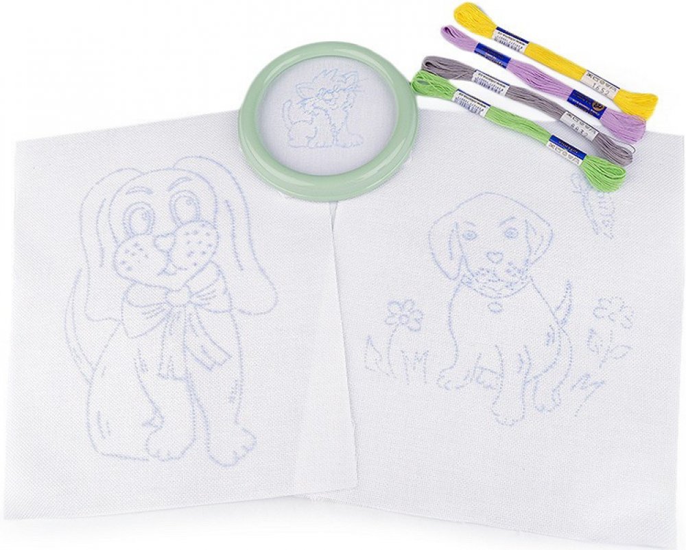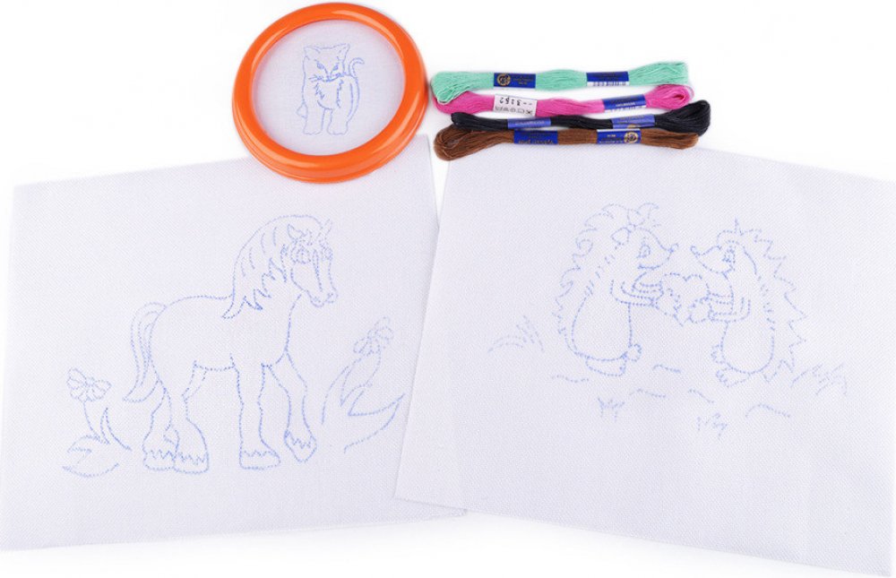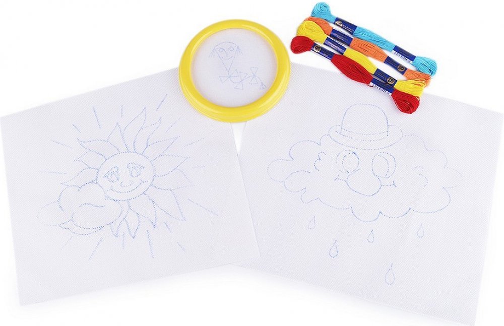 [Zabavte vaše šikovné děti vyšíváním. Souprava dětského vyšívání obsahuje kulatý rámeček s látkou, která má předtištěný vzor, 4 kvalitní vyšívací příze mouline ze 100% bavlny a dvě větší plátna (23 x 26 cm) s předtištěnými motivy.
